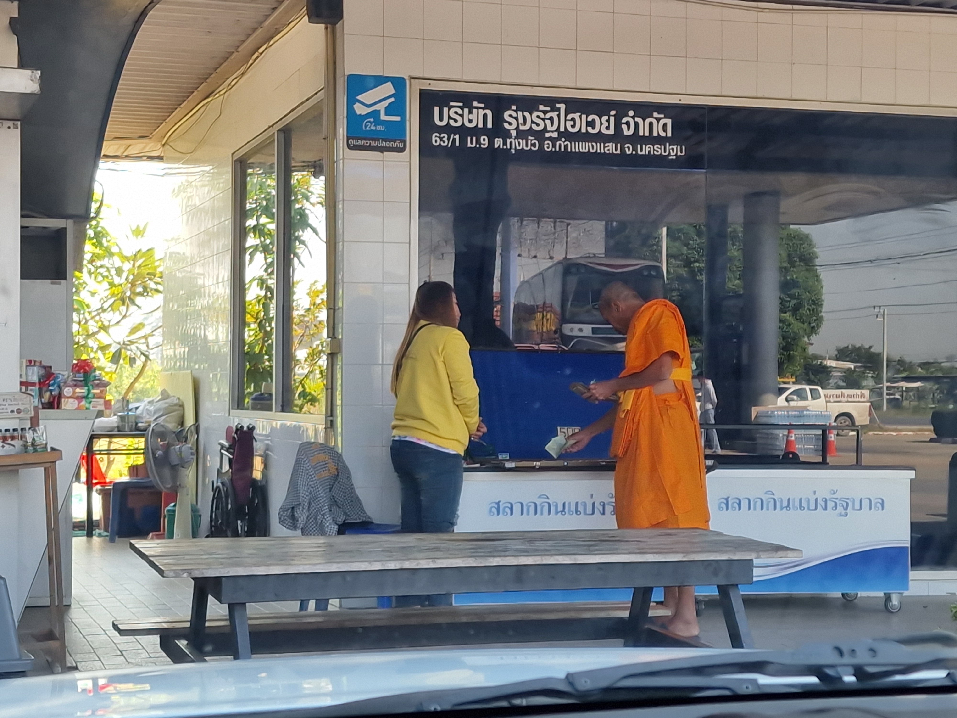 Bij een tussenstop zie ik vanuit de auto een monnik loterijbiljetten kopen. Ik weet niet of dat volgens het boekje is, maar mensen zijn mensen. Ook monniken.