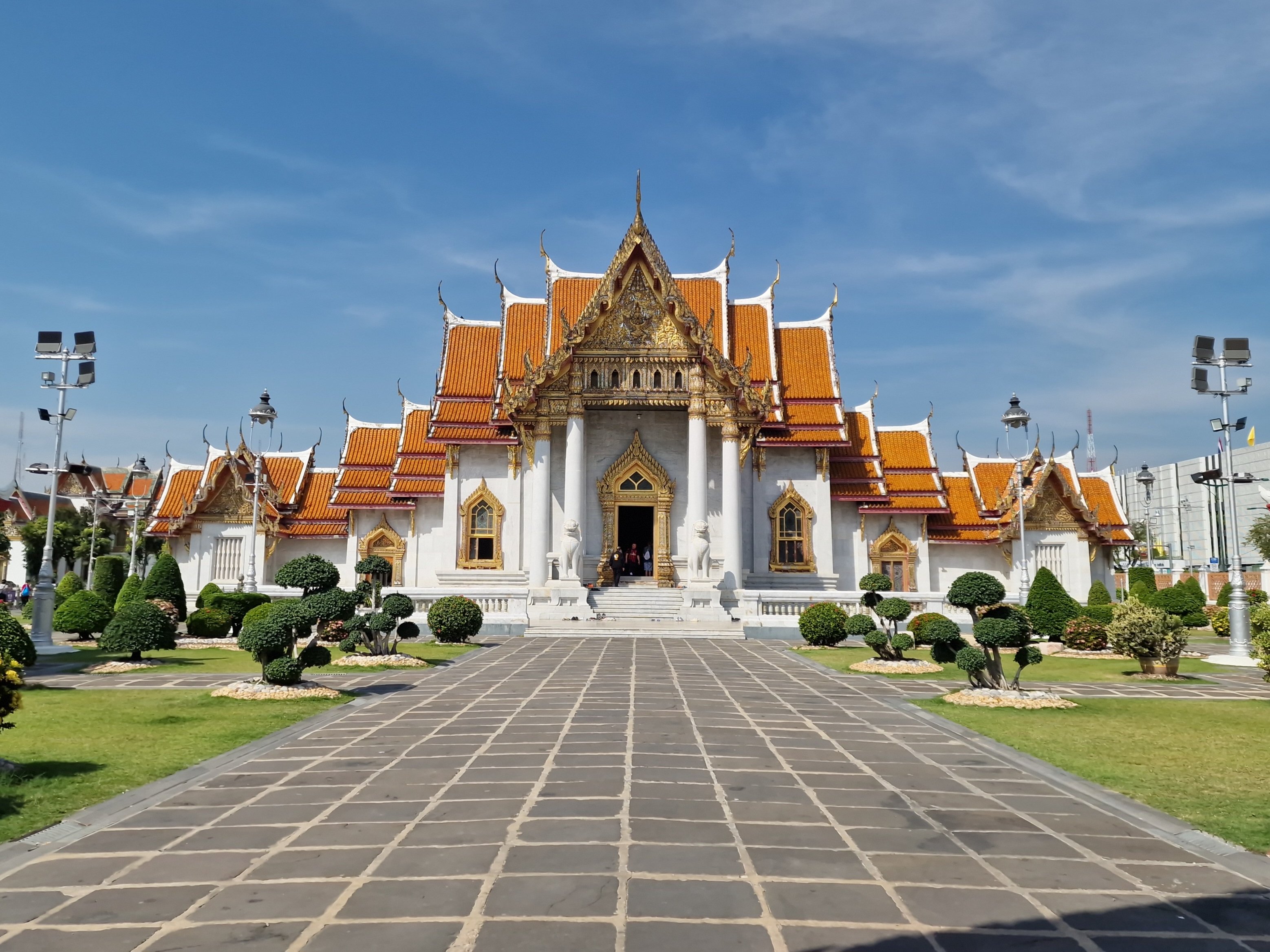 Wat Benchamabophit. Een mooie tempel naast het koninklijk domein. Even twijfelen we om hem te bezoeken, maar we beseffen algauw dat onze fietsoutfit niet compatibel is met de kledingsvoorschriften. Een volgende keer dan maar.