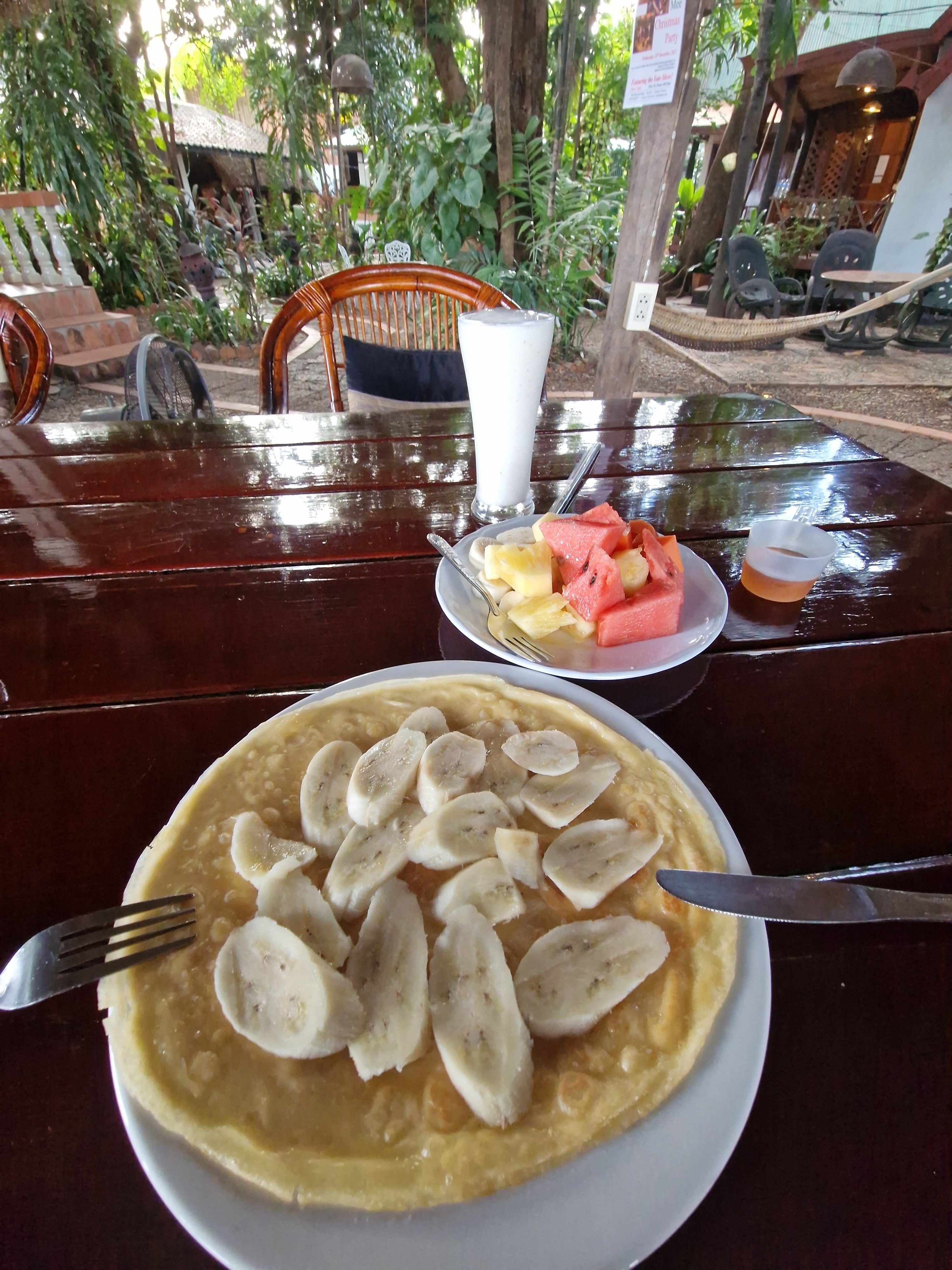 Vandaag neem ik een rustdag, of beter gezegd, ik blijf in Nong Khai maar plan wel een ommetje met de fiets. Vooraleer ik vertrek geniet ik van een lekker verwenontbijt: een bananenpannenkoek met watermeloen en een fruitshake. Dat doet deugt, want het ontbijt in de kleine hotelletjes tijdens de vorige dagen was eerder karig: rijstsoep met een confituurtoast. Of confituurtoast met rijstsoep. Of gewoon niks. Omdat ik niet met een lege maag de fiets op wil werd het dan meestal een Seven-Elevenontbijt van voorverpakte kant-en-klaarboterhammen, en/of wat banaantjes, of sandwiches met pandan- of taro- of kokosvulling. Allemaal wel lekker, maar ik kan de versgebakken pannenkoek die nu op mijn bord ligt wel erg appreciëren.