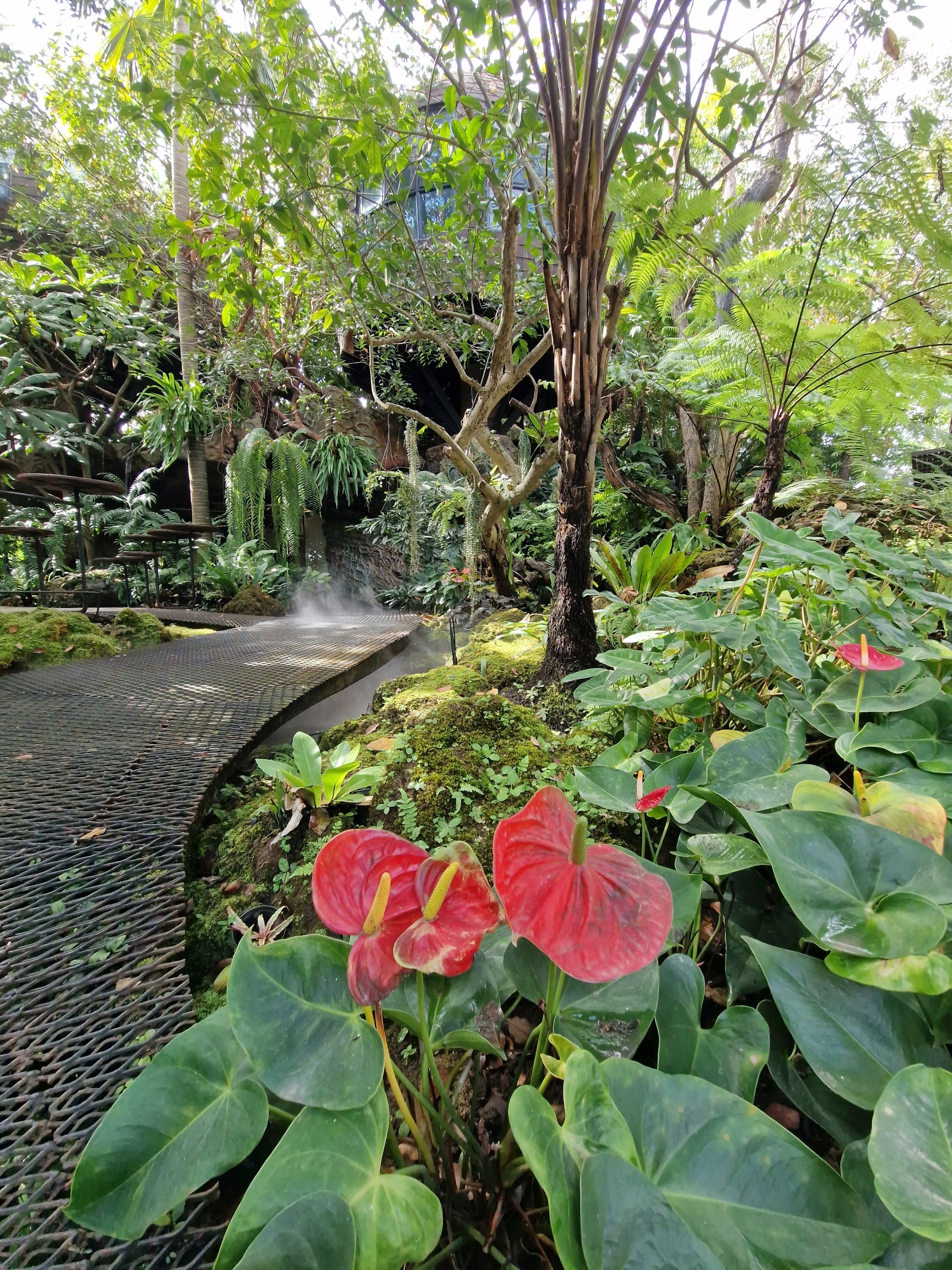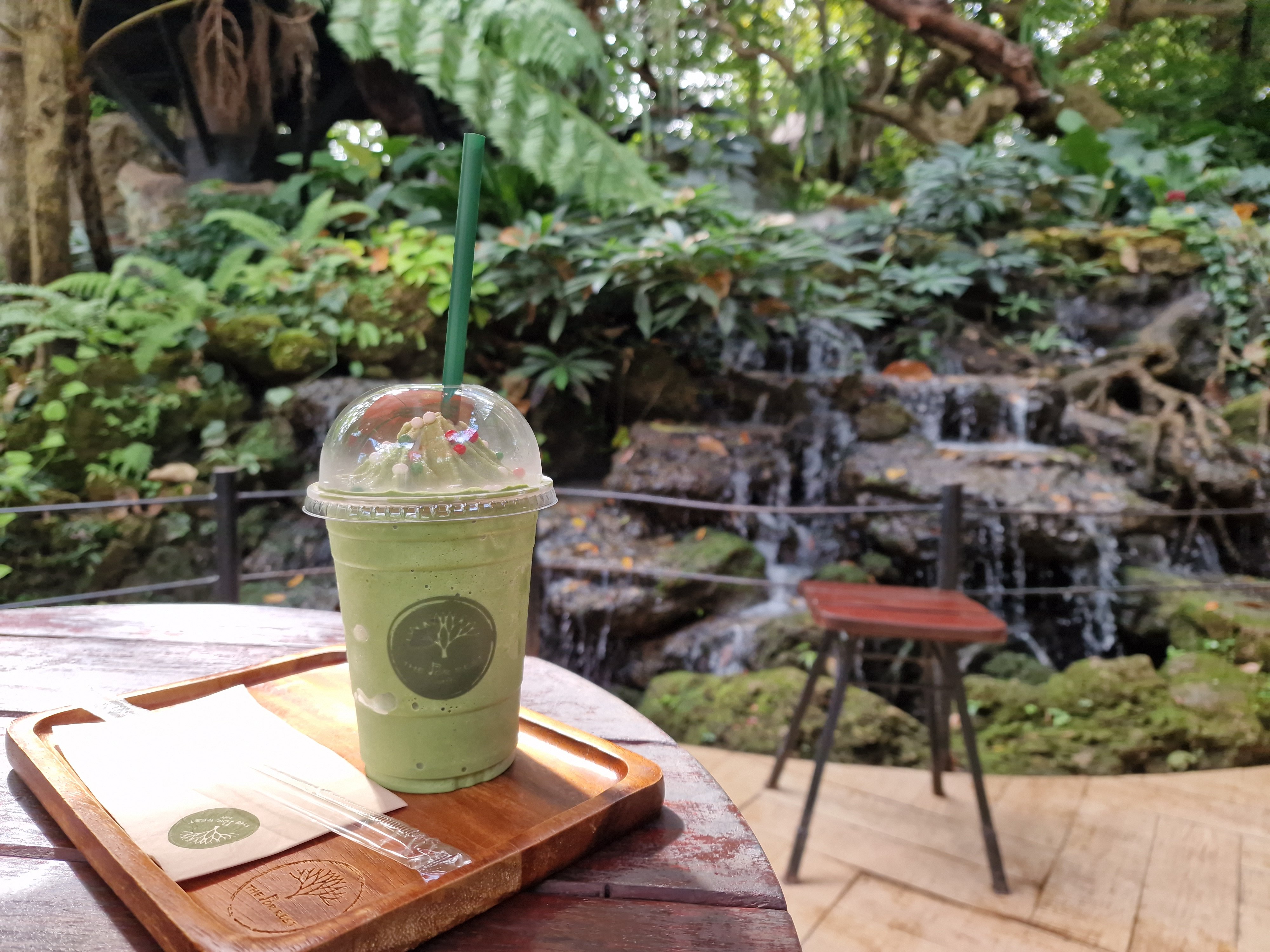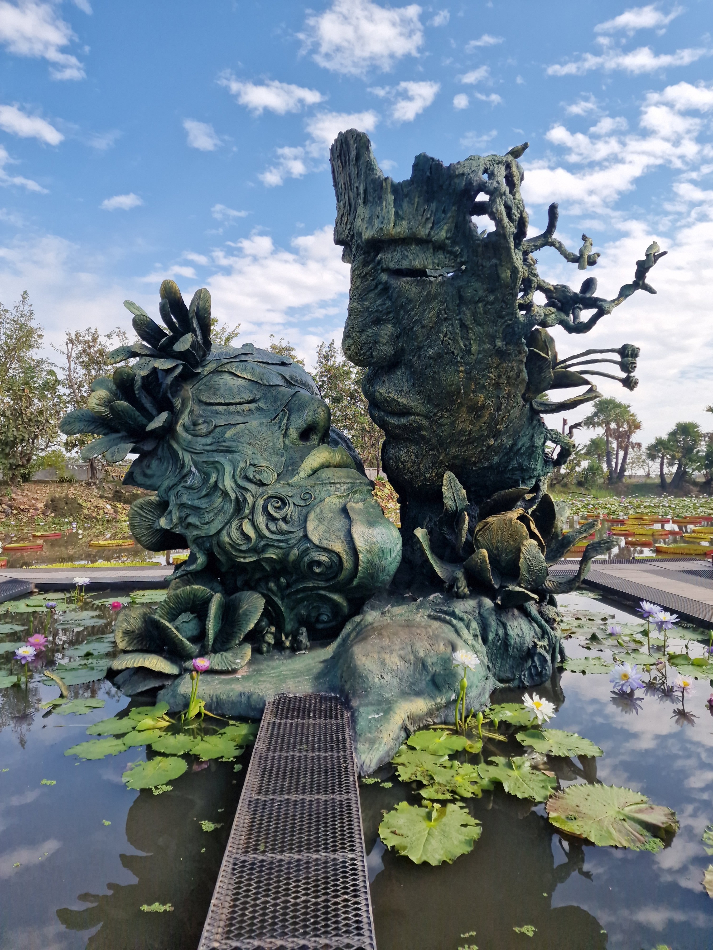 Een korte fietsrit brengt me naar de rand van Nong Khai, waar ik een hip café met speciale tuin bezoek: ‘Nong Khai Giant Lotus’. De publiekstrekker is een grote vijver met daarin een hele collectie waterlelies en lotussen – met onder meer de victorialelie met reuzachtige schotelbladeren. Te midden staat een kitcherig bronzen beeld dat twee bijna kussende gezichten toont. De setting is wel mooi, moet ik toegeven. De nevelwoud-rotstuin vind ik nog indrukwekkender. Ultrasone mistmakers hullen knoestige stammen met daarop mos en epifyten in een geheimzinnige nevel. Op de nevelheuvel staan enkele bolvormige kamers waarin je je drankje uit het café kan nuttigen. Ik bestel een matcha-shake en neem plaats naast een kunstmatig watervalletje dat deels gehuld is in nevelslierten. Wat een bijzondere sfeer. Ik geniet en doe het rustig aan vandaag.