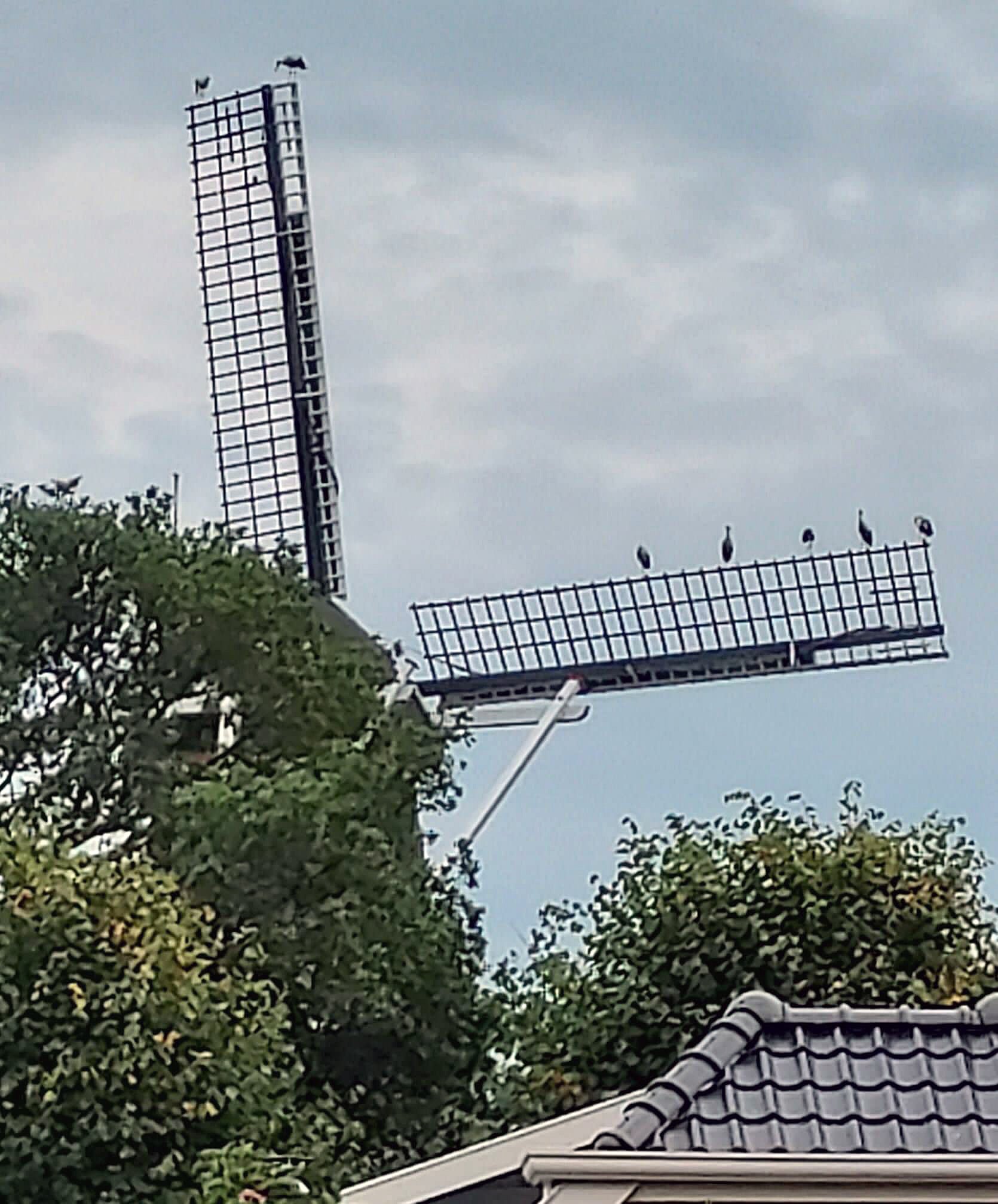 Afgelopen maand zaten er op een dag liefst zestien ooievaars op de wieken, die de pas aangebrachte verf op het gevlucht hebben onderscheten.... (niet mijn foto, komt uit Facebook van het dorp Kolham).