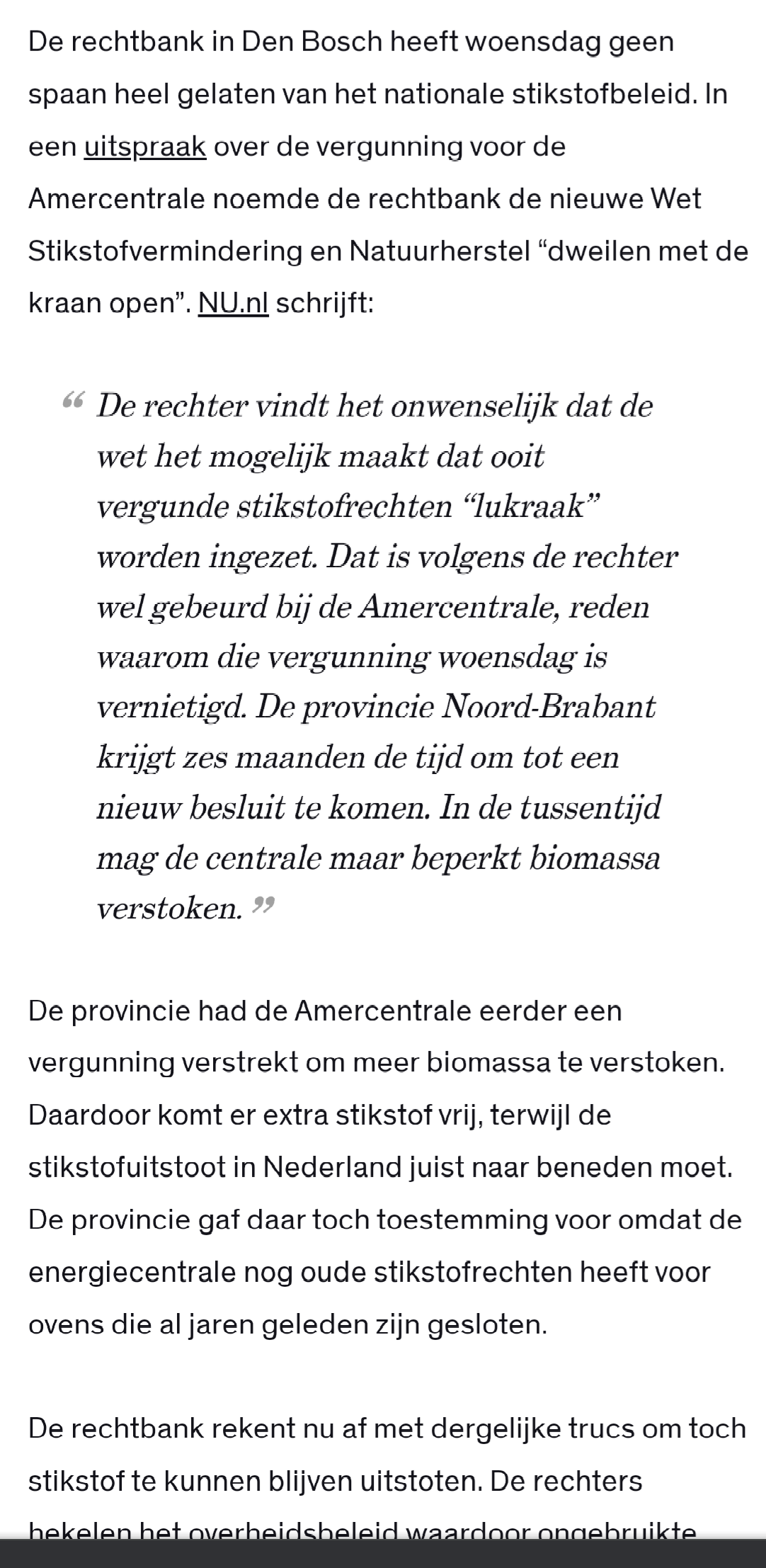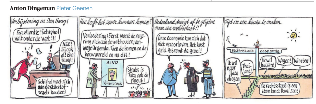Vanwege corona en pragmatische kabinetten is er nog vrij weinig aandacht naar uitgegaan, maar ik verwacht dat het dossier 'juridische grenzen aan het economische beslag op de aarde' binnen enkele jaren een grote splijtzwam zal worden in de Nederlandse politiek. Nu zijn het nog vooral de populistische partijen die oproepen tot verzet. Het sentiment zal denk ik ook bij veel VVD-stemmers omslaan zodra Nederland voortdurend teruggefloten wordt door rechters en Europese instanties, en kabinetten serieus impopulaire maatregelen gaan nemen. (Denk hierbij niet alleen aan nieuw beleid, maar ook het daadwerkelijk handhaven van bestaande milieuregels in de agrarische sector in plaats van wegkijken door de NVWA, onderdeel van LNV, geleid door minister Schouten.) Ik durf geen weddenschap af te sluiten over wat er dan als winnaar uit de bus komt: rechtsstaat of economie. Ik hoop het eerste, ik vrees het tweede.