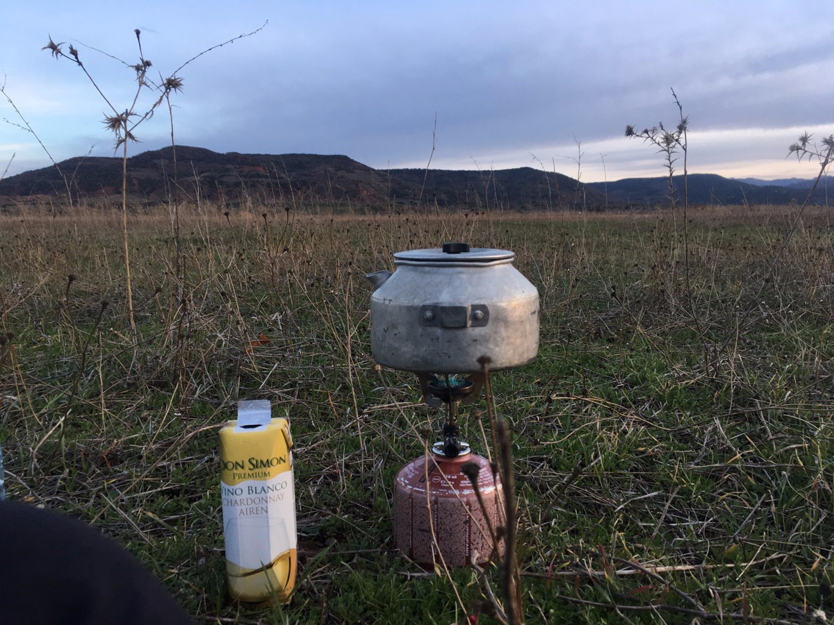 ‘s Morgens blijk ik in een wolk te zitten. Van het prachtige uitzicht zie ik niets meer. Het is echt druilig wat niet tot spoed bij opbreken aanzet. Ik moet ook nog mijn wijsvinger verzorgen want het gepuzzel met de tent gisteren heeft een ferme vil in het vlees opgeleverd; langs een piket geschoten die verzet moest worden. Wanneer ik de fiets met bagage terug naar boven, naar de weg heb gesleurd ben ik kletsnat van door de druipende struiken en kletsnat gras te duwen.