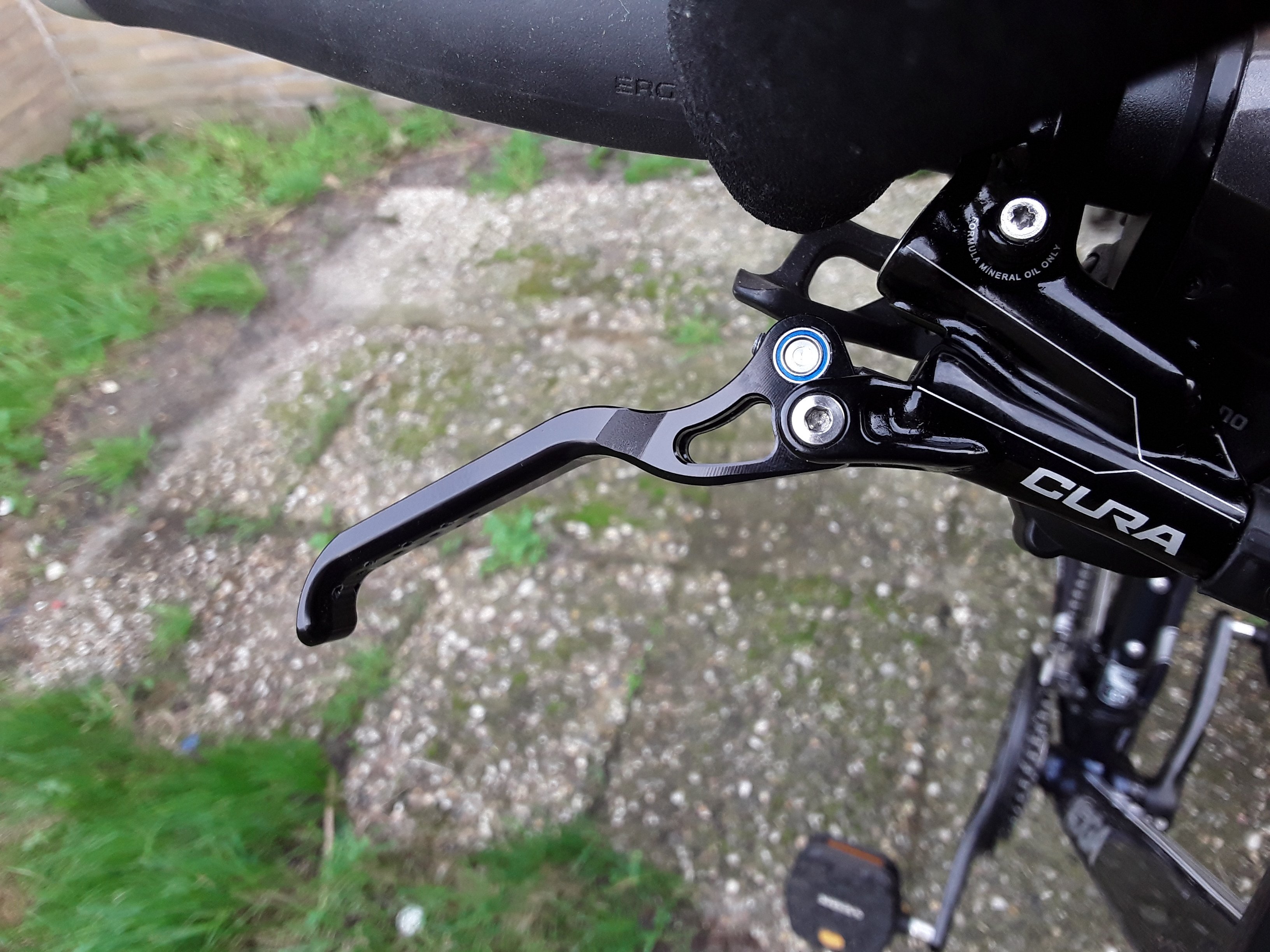 Vanochtend mijn nieuwe remhendels gemonteerd. De originele hebben plastic busjes en deze hebben lagers die er in zijn geperst. De barrel nut (geen idee hoe je die in het Nederlands noemt) voor de reikwijdteverstelling is er ook in geperst met als resultaat dat er nergens speling op zit. Je zou denken dat dat niet veel verschil maakt maar dat doet het dus wel. Het voelt nu veel strakker en met de extra lengte is de remkracht ook groter. Echt een mooie upgrade voor Cura remmen.
