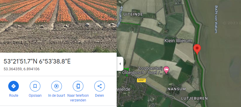 Ik stond ik hier op de dijk: https://www.openstreetmap.org/#map=19/53.32106/6.46300, omhoog gelopen bij de bomen langs de weg op jouw google-link.