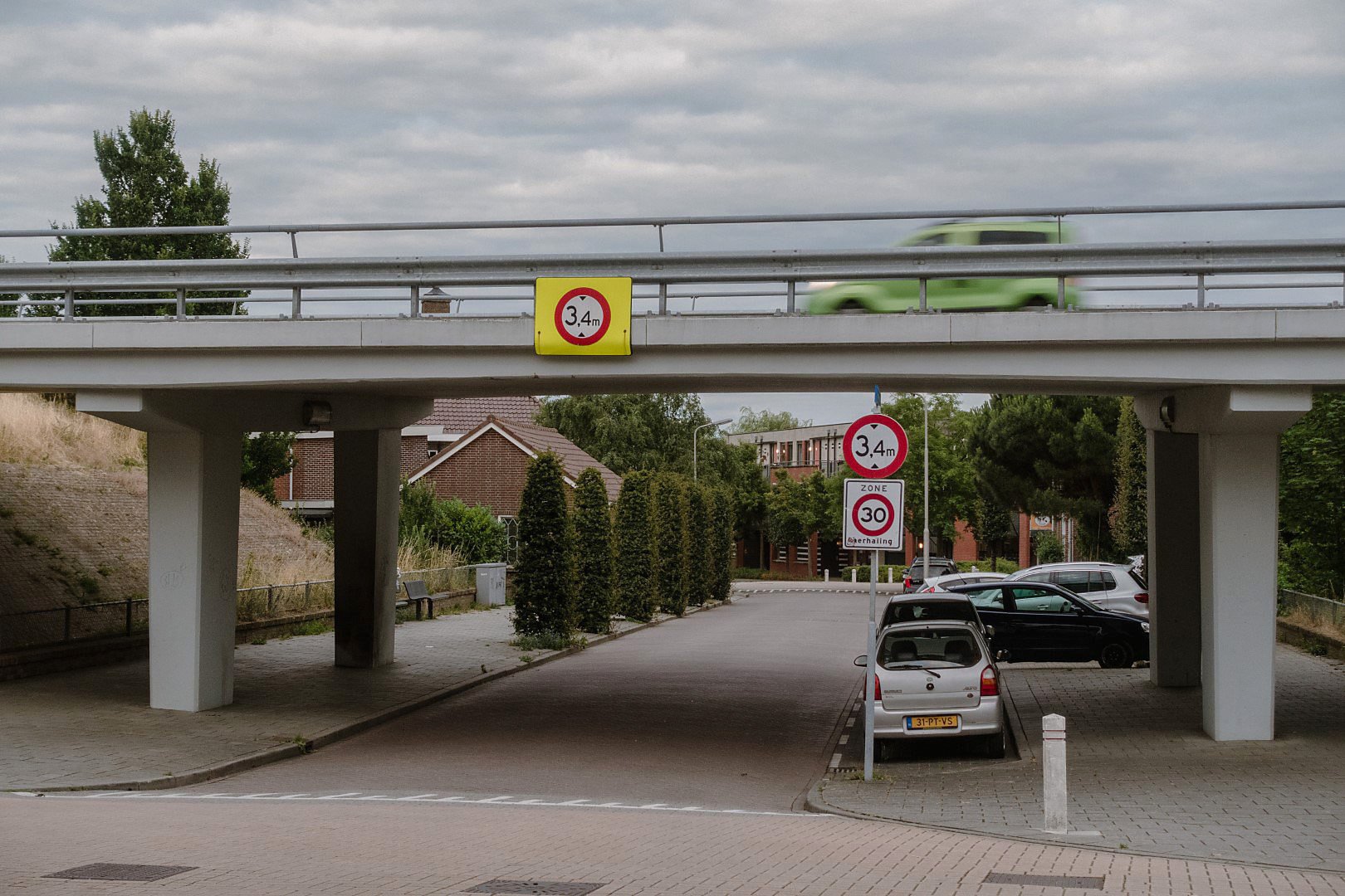 Al fietsend kom je soms vreemde zaken tegen. Hier een drukke provinciale weg dwars door een dorp en ook nog eens op een talud zodat het lawaai ver reikt. Waar is dit (dorp en straat).