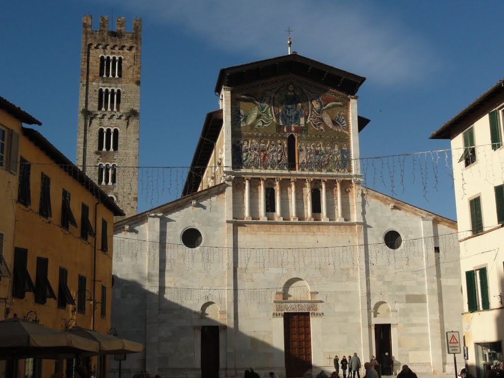 Heel goed, Tovenaar! Dacht ik al dat het te makkelijk zou zijn. Inderdaad de San Ferdiano in Lucca. Wat kon het gouden mozaïek onder de geveltop in de vroege ochtendzon prachtig schitteren. Ik sliep in de "ostello" (jeugdherberg) welke pal naast de kerk is gelegen. Op de foto van het gebouw, vanaf de stadsmuur genomen, steekt die geveltop met het mozaïek rechts boven het dak uit.