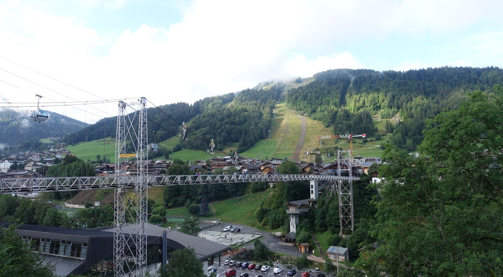 Heel lastig, ik bekeek het model van die grijze kabelbaancabines. Met die zwarte bollen op de hoeken. Gegoogeld met Bergseilbahnen Österreich, daar komen die dergelijke cabines op meerdere plaatsen voor maar ook in het Beierse Ällgau. Maar die aparte fiets-hangbrug valt niet te googlen! Ook niet in de andere Alpenlanden.