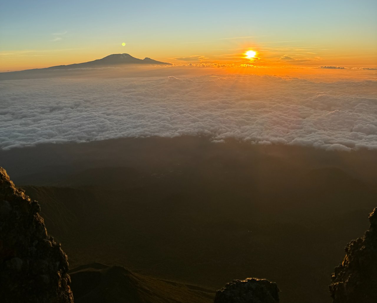 Het uitzicht is op de Kilimanjaro, een berg die je eigenlijk direct herkend als solo vulkaan met dat speciale tussentopje.