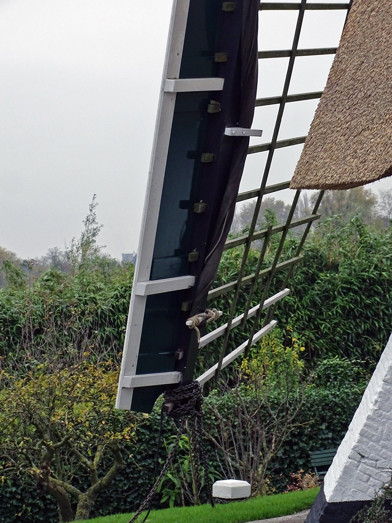 Heel apart zijn hier de drie witte "scheerhouten", hier links. Die lopen niet door als hekwerk (zoals op mijn molen) aan de andere kant van de roede. Dit is een typische manier van de Rotterdamse molenmakers. Ze komen alleen in en rond Rotterdam en langs de Rotte voor.