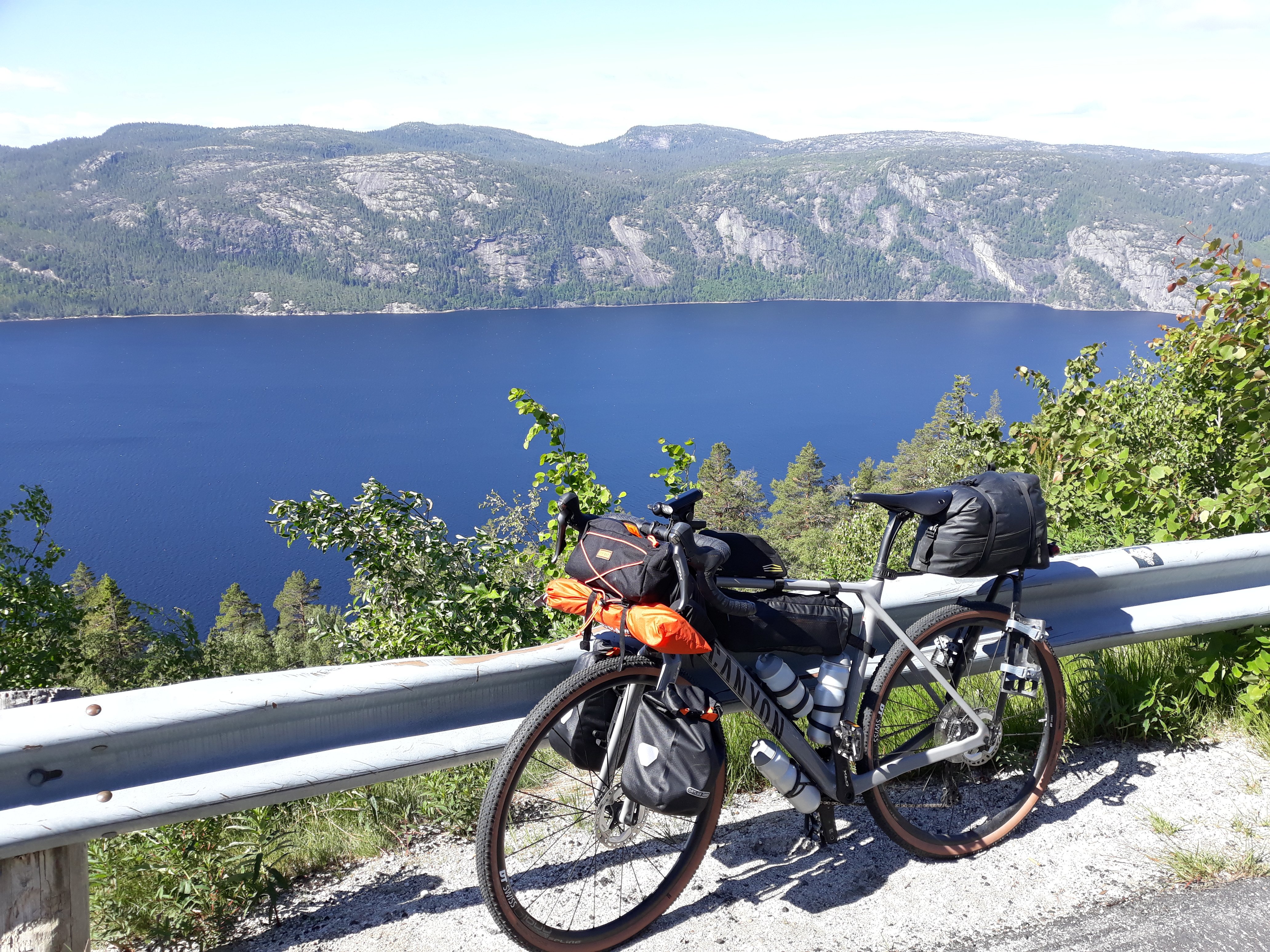 Aanpassing qua tassen is vooral de voorkant, ben qua stuurrol overgestapt op een harnas met drybag voor gemakkelijker inpakken. En heb met het racestuur iets minder ruimte in de stuurrol en had voor een ronde in Noorwegen iets meer warme kleding en ruimte voor voedsel nodig, dus daarom aangevuld met twee Ortlieb Fork Packs. Ik ben al met al zeer tevreden over deze setup, vooral het feit dat bijna elke tas makkelijk van de fiets gehaald kan worden maakt het in-/uitpakken erg gemakkelijk! En het extra beetje volume van de fork packs maakte het ook makkelijker om spullen te organiseren ipv elk klein beetje ruimte vol te moeten proppen waardoor spullen overal en nergens terechtkomen!