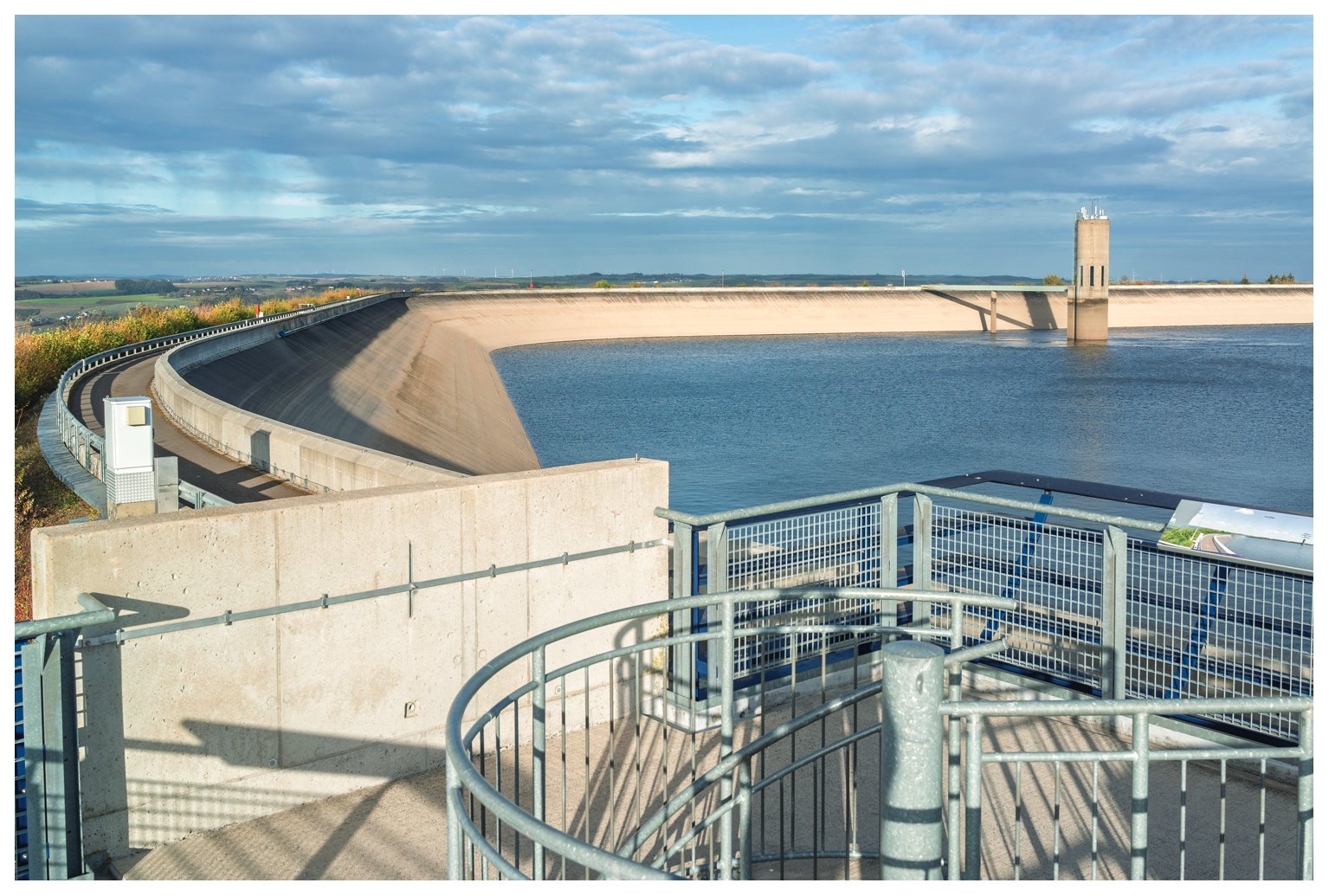 Het was iets noordelijker, maar wel hetzelfde uitzicht. Er is niet veel Streetview vanaf dat standpunt. @Poppink: dat is een andere toren. Het was geen fietsweer en we maakten een rondwandeling vanuit Vianden onder meer langs Burgruine Falkenstein. Het complex welke ik bedoelde was het Pumpspeicherwerk Vianden, de fietsroute komt er langs, je kan naar binnen lopen en de rij enorme turbines bekijken alsook de grote meet- en regelkamer. Wanneer er weinig vraag naar energie is wordt het bovenste stuwmeer vol gepompt, bij grote vraag naar energie laten ze dat weer leeglopen. Het geheel heeft net iets meer vermogen dan onze Maasvlakte-centrale (toch ook geen kleine jongen). Hieronder een foto van het bassin supérieur (met toren) en het bassin inférieur bij Vianden met de bekende stuwdam. Aan jou de volgende.