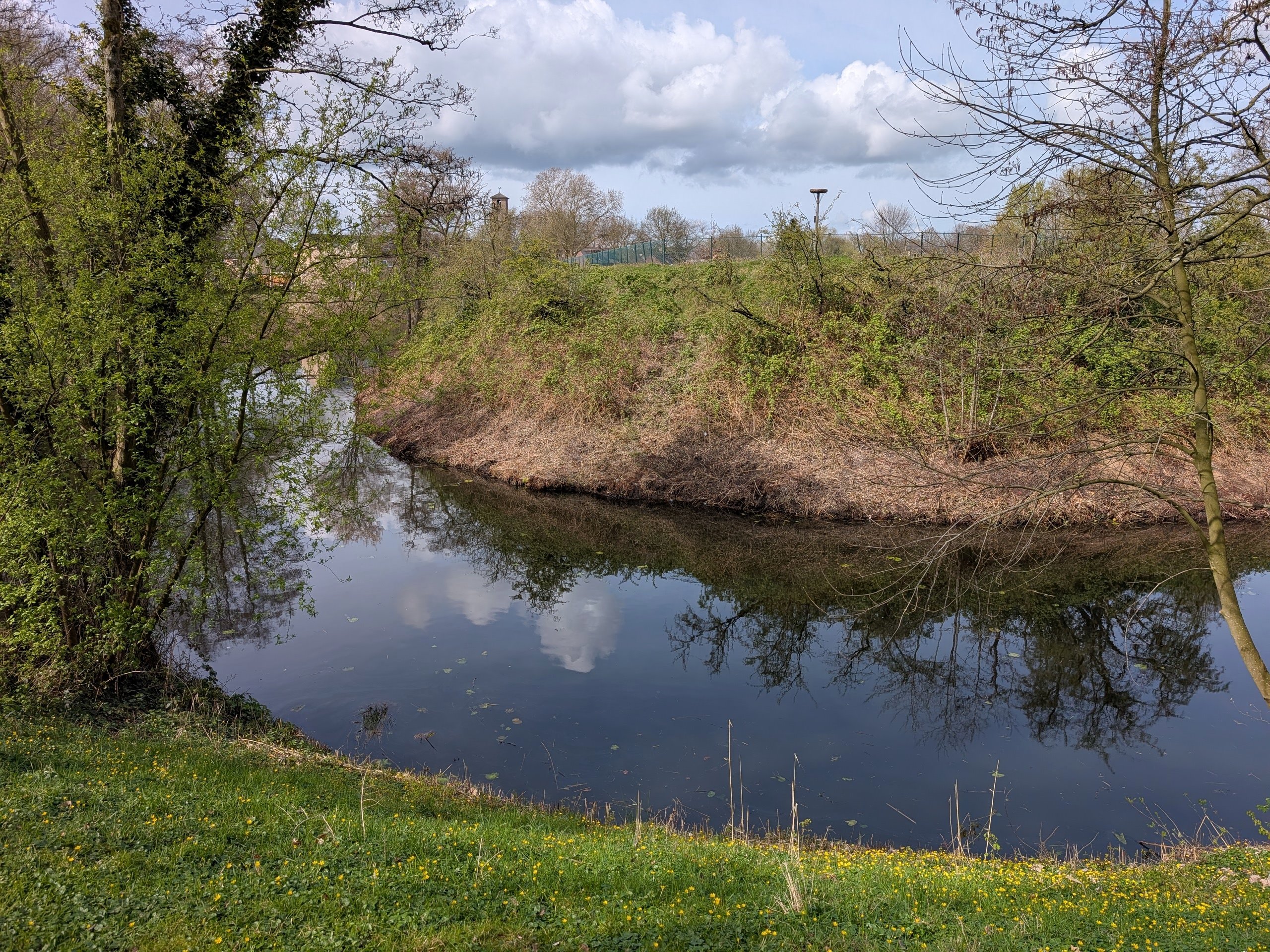 Ik heb vroeger heel vaak in en rondom 's-Hertogenbosch gefietst en die na-oorlogse kerktoren komt me zo bekend voor. Dit is de R.K. San Salvatorkerk, dan moet het ooievaarsnest op Fort Orthen staan. Helaas is er geen Streetview op de plek waar je stond, dan maar genoegen nemen met deze: