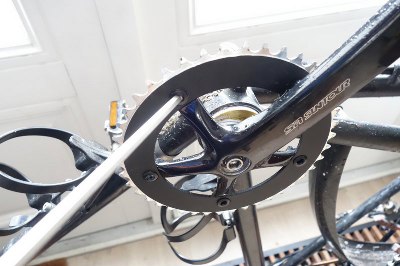 Bij de cranckarm heb je ook de optie om het voortandwiel aan de binnen- of buitenkant te monteren, dat scheelt zo 1cm of meer, maar dat had ik vanzelfsprekend aan de buitenkant gedaan.