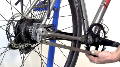 De riem krijg je op maat; je geeft de afstand op van hart achteras tot hart cranckstel. Met mijn excentrische trapas heb ik ongeveer 20mm speling en ik heb het minimum + 5 mm opgegeven.