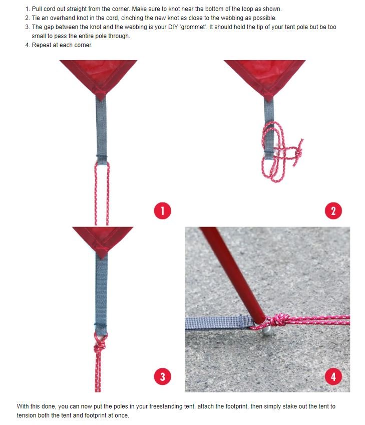 De lusjes van de footprint worden door de knoop wat korter en zijn dan net zo lang als die van de binnentent.