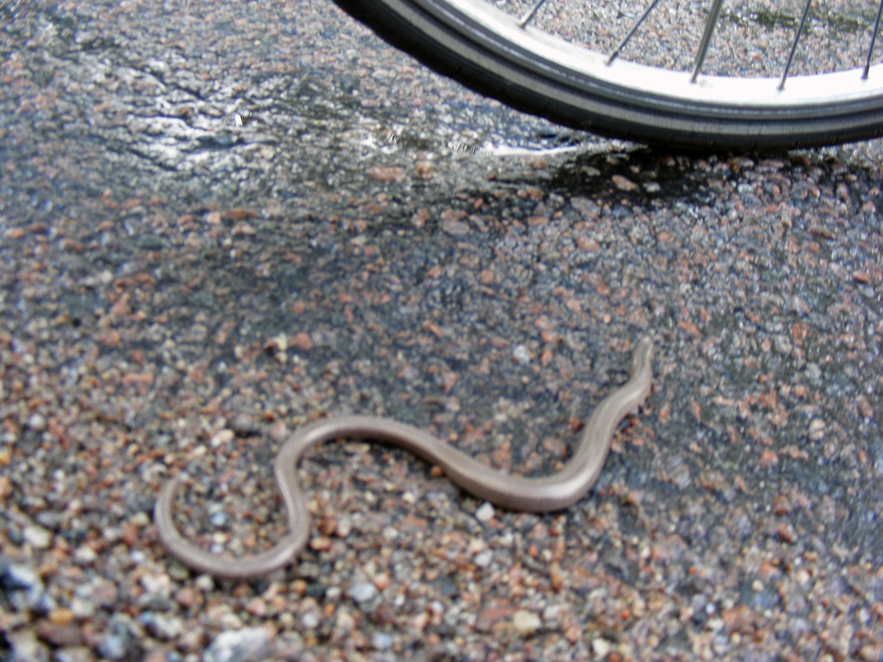 Gladde slang. Na het nemen van deze foto tilde ik met een takje de slang op en legde het dier wat verderop in de vegetatie, anders zou een auto eroverheen zijn gereden....