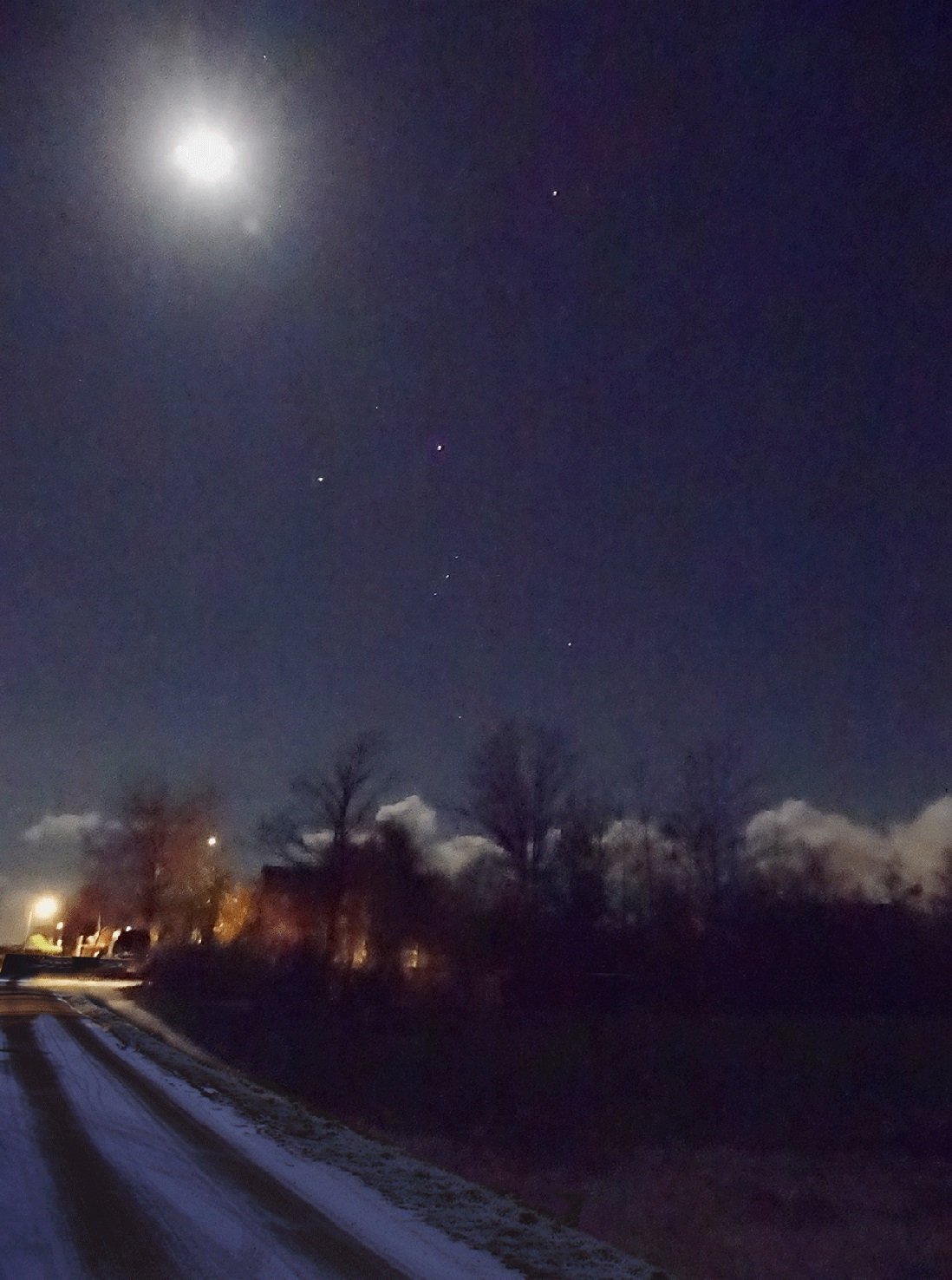 Hieronder nog een maanfoto, maar in de tegengestelde richting als mijn vorige maanfoto, met camera op statief. Het was al 11 minuten over middernacht. Zelfs de Orion is hier goed zichtbaar. Het felle lichtje schuin daaronder is een lantaarnpaal.