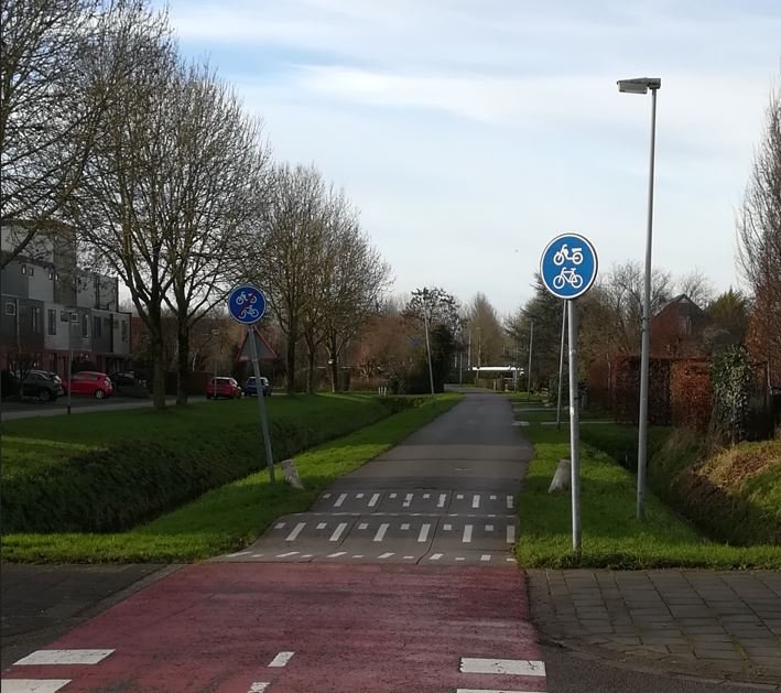 Er kwam een langzaamverkeersvoorziening. Als fietspad kon het niet aan de normen voldoen, dus werd het een voetpad met "fietsen toegestaan"; dan ben je van de normen af. Daarna moesten er paaltjes komen. Die kwamen er, drie. Maar de gemeente wilde geen paatjes dus kwamen er stenen. Ook klaagden automobilisten (busjes, onderhoudsvrachtauto's etc.) die er moesten zijn dat ze er niet in konden. De oplossing is even eenvoudig als geniaal: één paaltje, één steen en éénmaal voldoende ruimte voor de auto's die er moeten zijn. Ter beveiliging kwam er een lantaarnpaal. Maar die staat niet op een zinnige plek. Niet erg als je toch niet verplicht aan normen hoeft te voldoen.