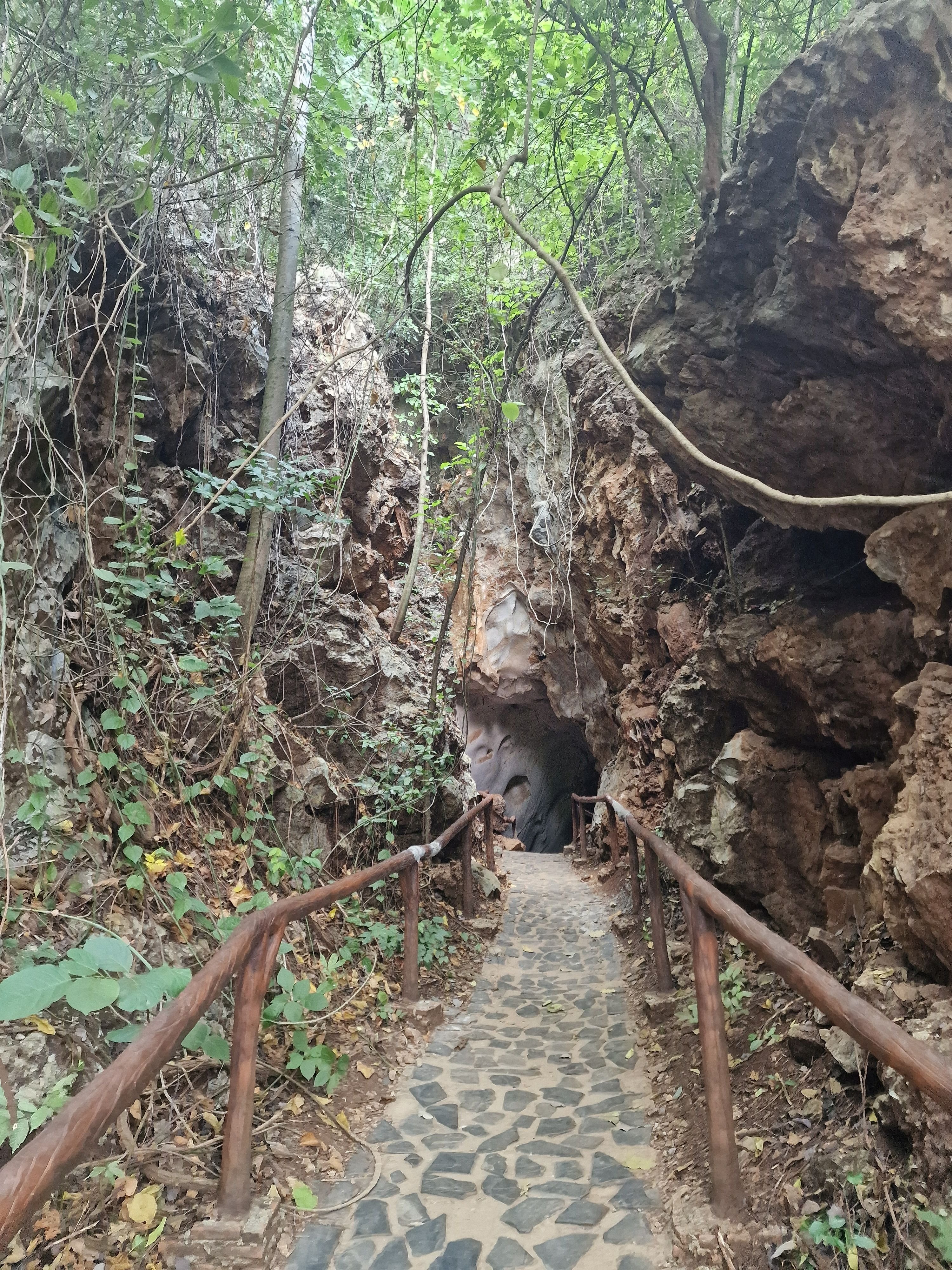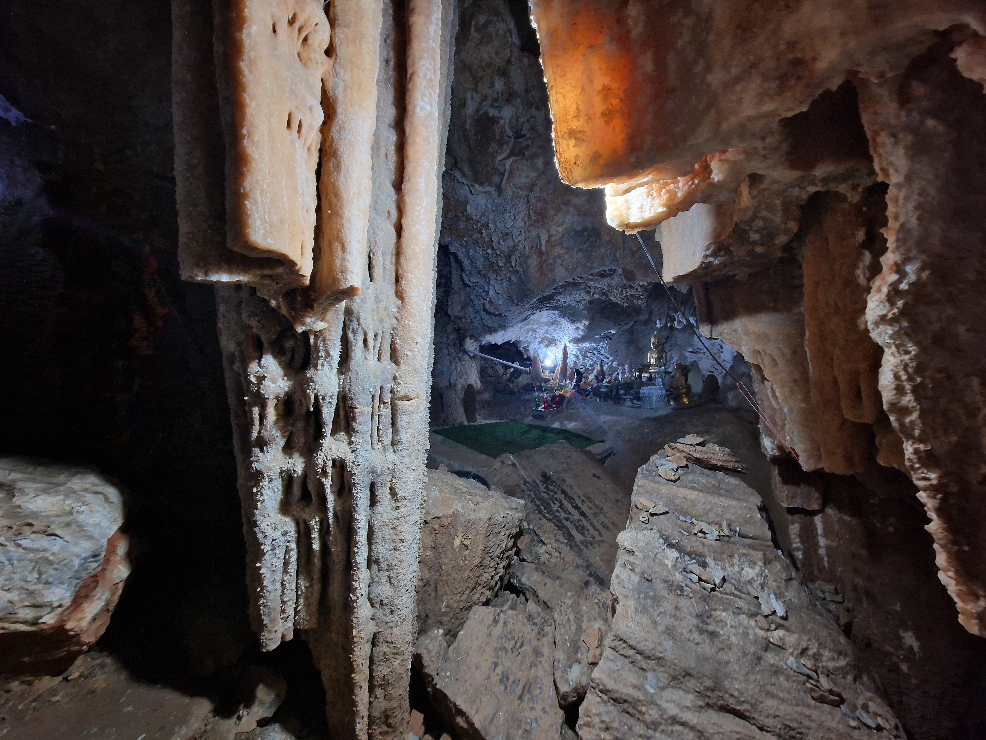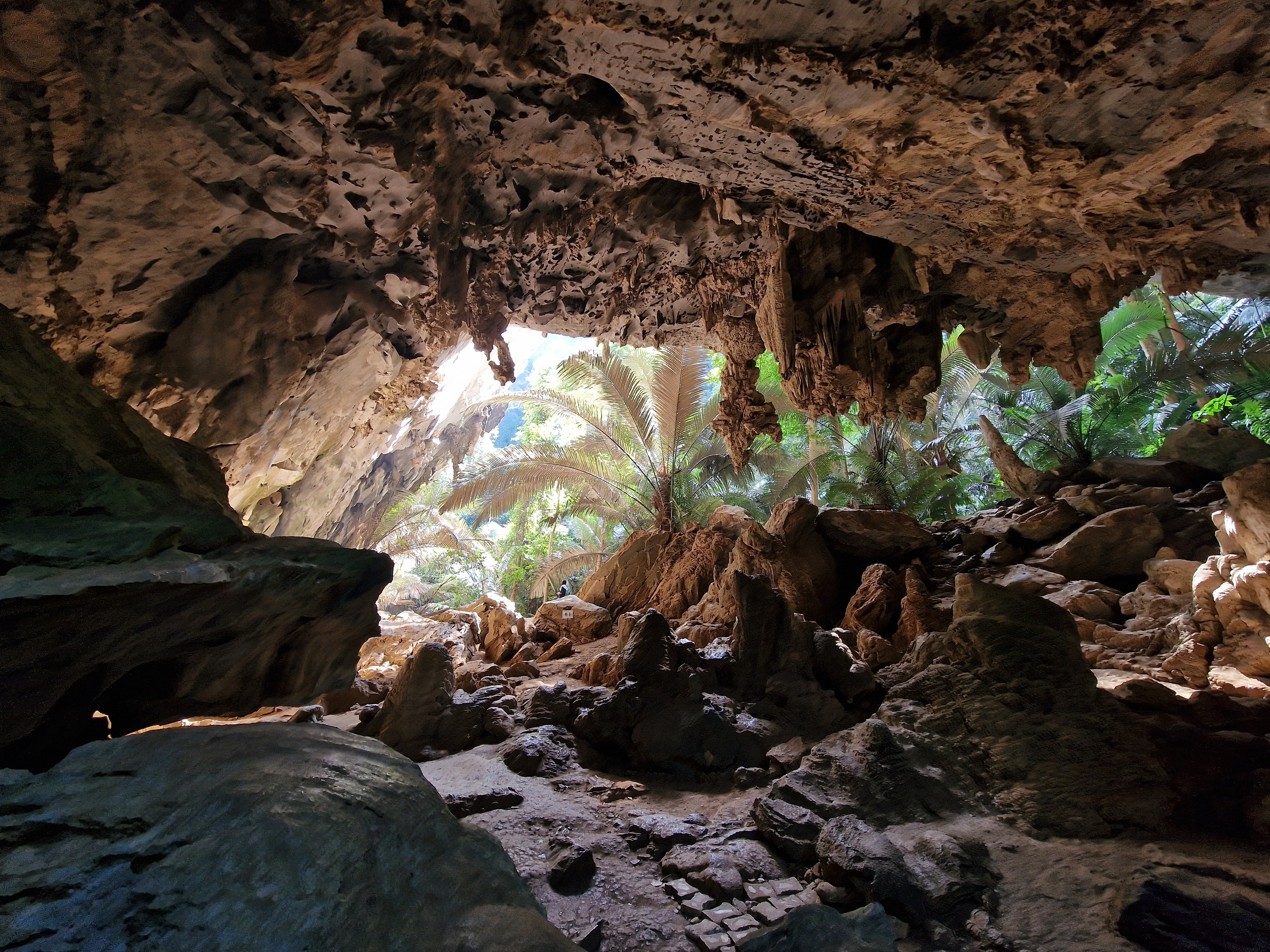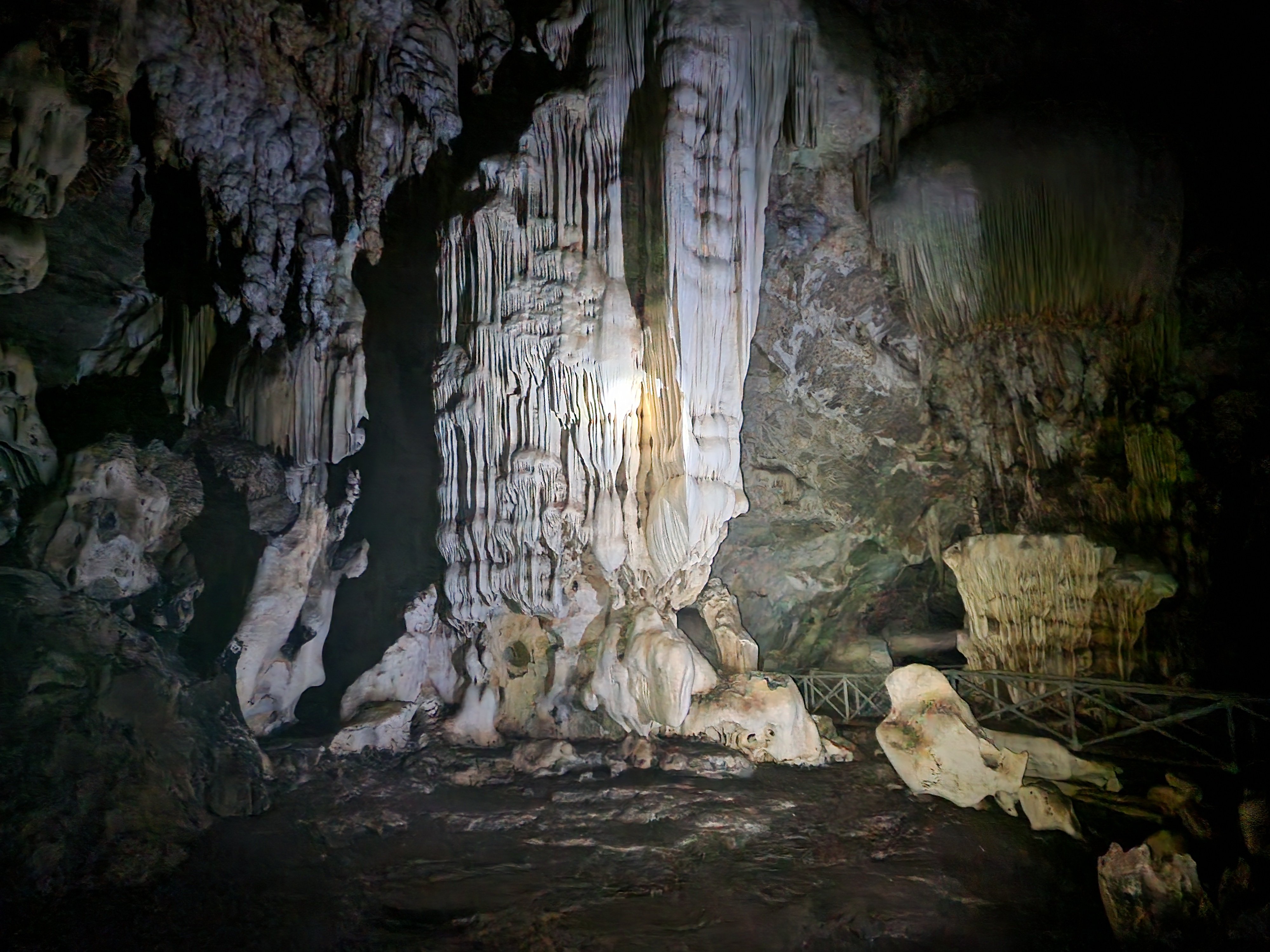 Ik sta wat te dralen en kijk hoe het zit aan de ingang van de grot, een wat claustrofobisch nauwe donkere spleet. Eens binnen is het pikkedonker. Gelukkig heb ik eraan gedacht om mijn fel fietslichtje mee te nemen. Ik begeef me traag verder en zie dat het pad breder wordt en de grot ruimer. Heel ruim zelfs. Terwijl ik mijn fietslichtje op de stalagmieten en -tieten richt hoor ik plots enkele stappen en zie een grote wiebelende verblindende zaklamp op me afkomen. Het blijkt de park official te zijn die niet had verwacht dat ik al tot aan de grot zou zijn geraakt. Hij neemt me mee op sleeptouw en laat me de highlights van de donkere grot zien. Ondertussen tsjirpen en fladderen de vleermuizen hoog boven onze hoofden. Hoog, want de grot blijkt meer dan behoorlijke afmetingen te hebben. Een betonnen pad met ballustraden leidt ons in een grote boog doorheen het duistere natuurschoon. Ik zie een druipsteenformatie in de vorm van een olifant (een goed gevoel voor pareidolie is wel noodzakelijk), een weelderig koraalrif , druipstenen bezet met glitters en als toetje een doorschijnende druipsteen die zo van een nachtkastje lijkt te zijn weggeplukt. Ondertussen zoek ik ook naar ongewervelde grotfauna, maar ik kom niet verder dan de grote populatie schattige grottensprinkhanen met hun gebochelde lijfjes en belachlijk lange antennen. Geen zweepschorpioenen of Heteropoda jachtkrabspinnen, helaas. Die deden enkele jaren terug in Laos mijn hart sneller slaan door een mix van angst en fascinatie. Onvergetelijke topmomentjes waren dat.