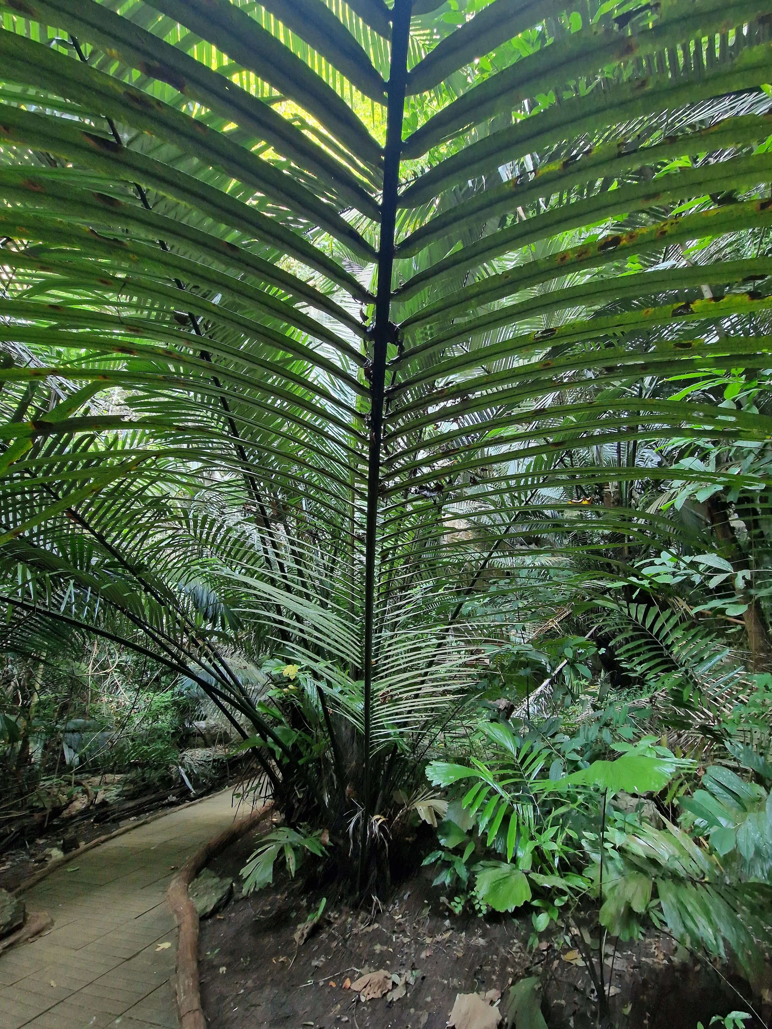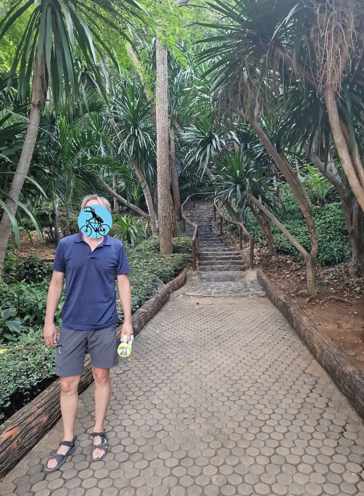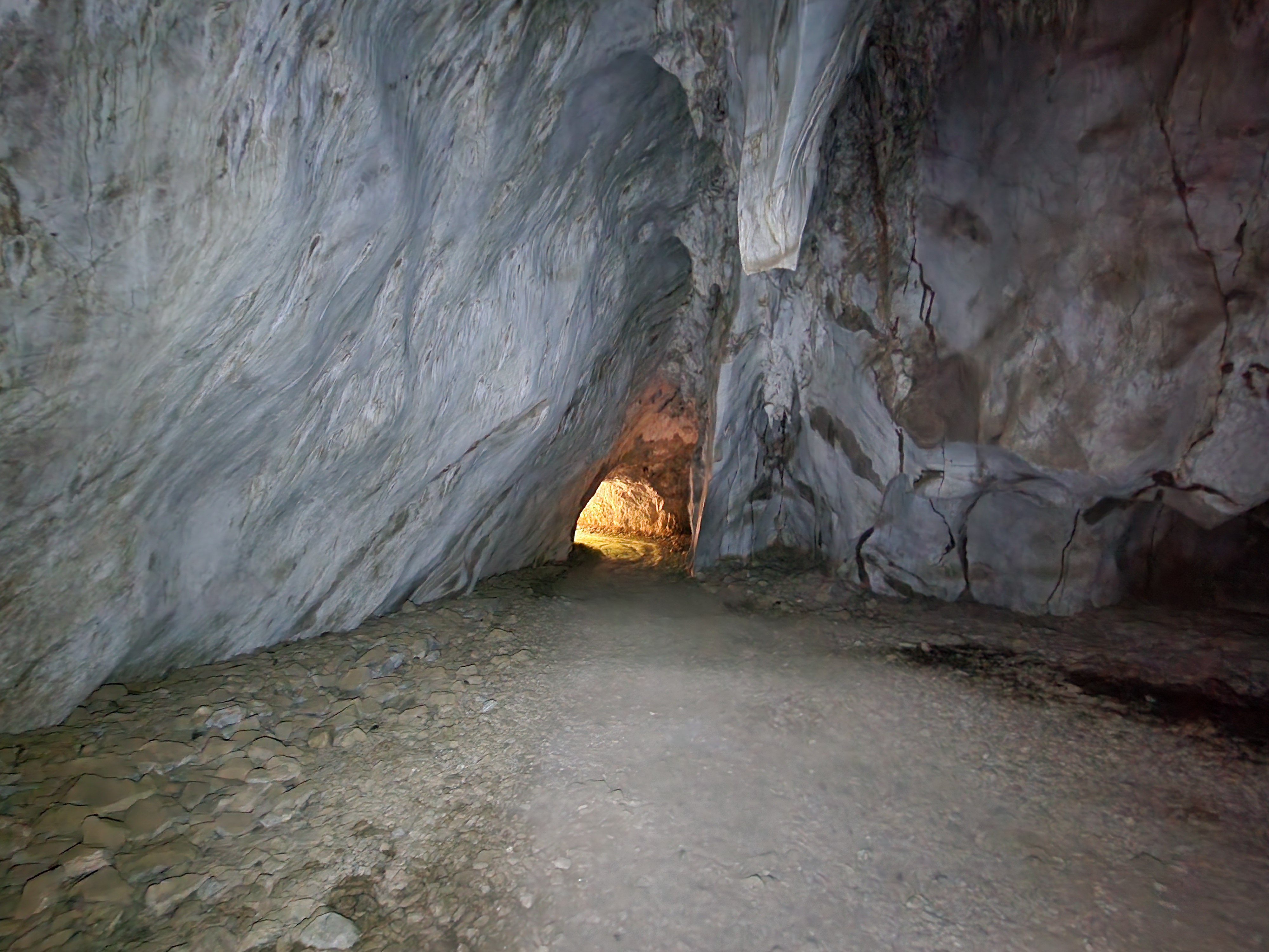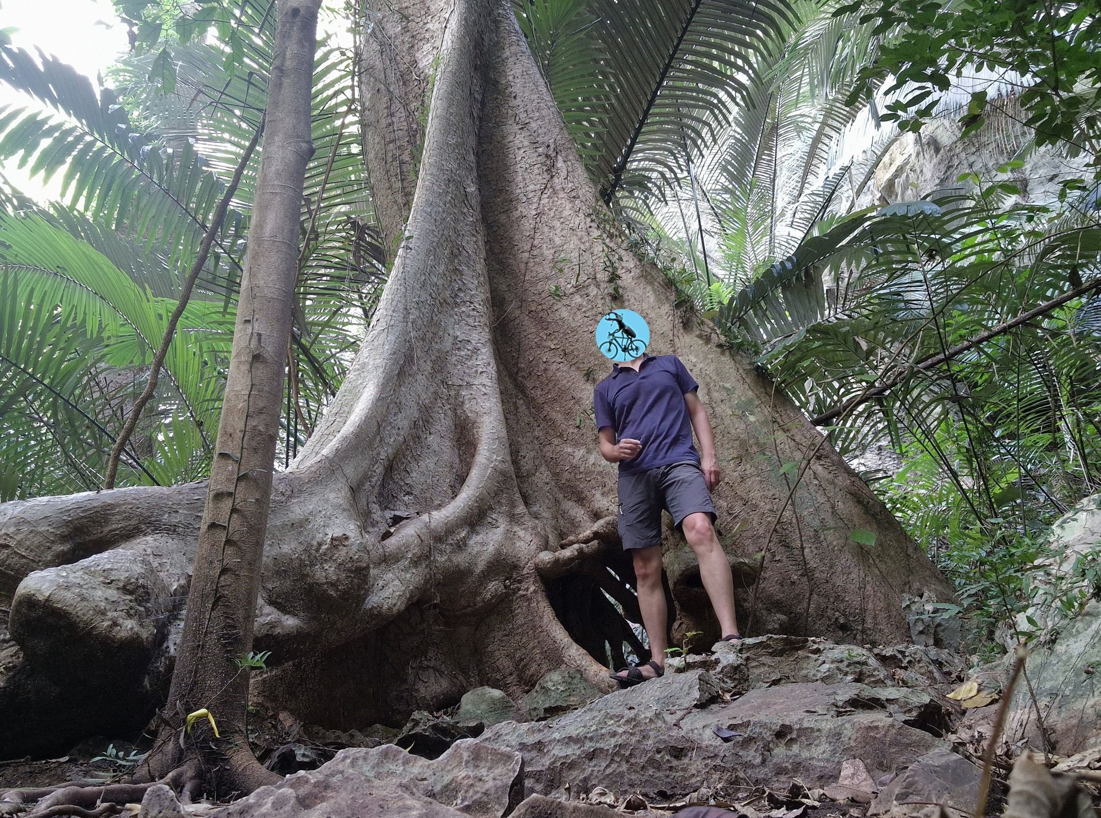 Ik sta wat te dralen en kijk hoe het zit aan de ingang van de grot, een wat claustrofobisch nauwe donkere spleet. Eens binnen is het pikkedonker. Gelukkig heb ik eraan gedacht om mijn fel fietslichtje mee te nemen. Ik begeef me traag verder en zie dat het pad breder wordt en de grot ruimer. Heel ruim zelfs. Terwijl ik mijn fietslichtje op de stalagmieten en -tieten richt hoor ik plots enkele stappen en zie een grote wiebelende verblindende zaklamp op me afkomen. Het blijkt de park official te zijn die niet had verwacht dat ik al tot aan de grot zou zijn geraakt. Hij neemt me mee op sleeptouw en laat me de highlights van de donkere grot zien. Ondertussen tsjirpen en fladderen de vleermuizen hoog boven onze hoofden. Hoog, want de grot blijkt meer dan behoorlijke afmetingen te hebben. Een betonnen pad met ballustraden leidt ons in een grote boog doorheen het duistere natuurschoon. Ik zie een druipsteenformatie in de vorm van een olifant (een goed gevoel voor pareidolie is wel noodzakelijk), een weelderig koraalrif , druipstenen bezet met glitters en als toetje een doorschijnende druipsteen die zo van een nachtkastje lijkt te zijn weggeplukt. Ondertussen zoek ik ook naar ongewervelde grotfauna, maar ik kom niet verder dan de grote populatie schattige grottensprinkhanen met hun gebochelde lijfjes en belachlijk lange antennen. Geen zweepschorpioenen of Heteropoda jachtkrabspinnen, helaas. Die deden enkele jaren terug in Laos mijn hart sneller slaan door een mix van angst en fascinatie. Onvergetelijke topmomentjes waren dat.