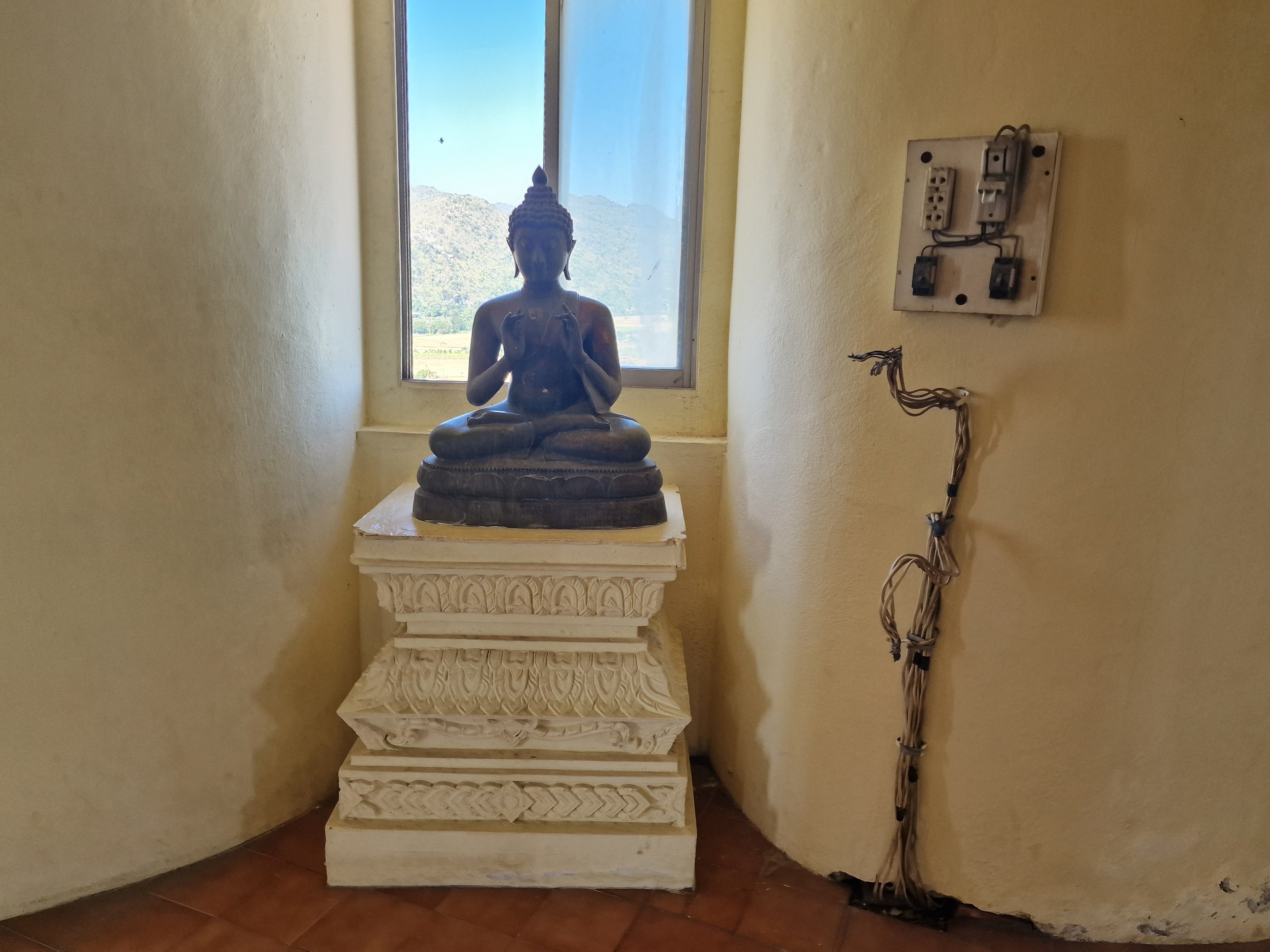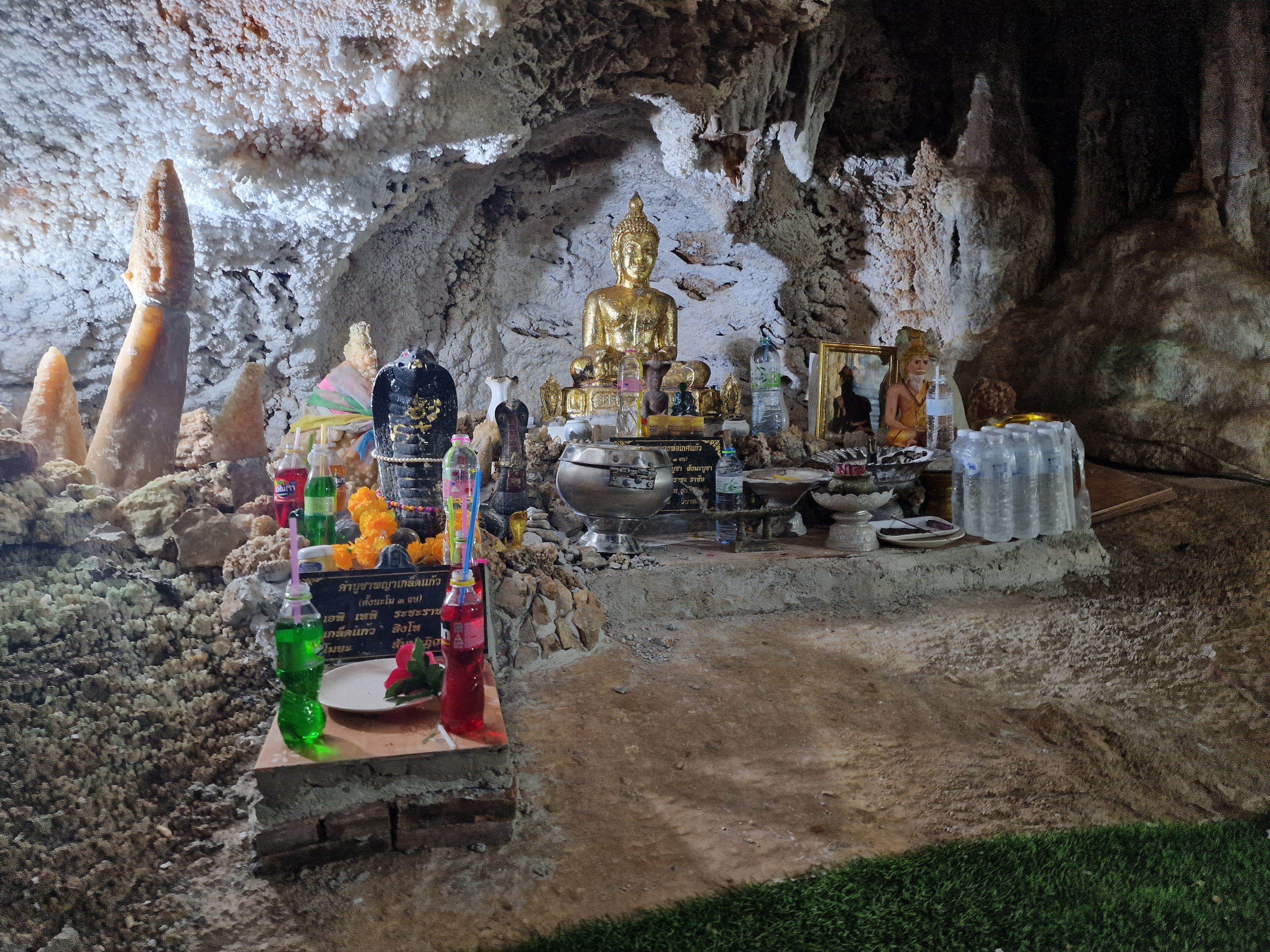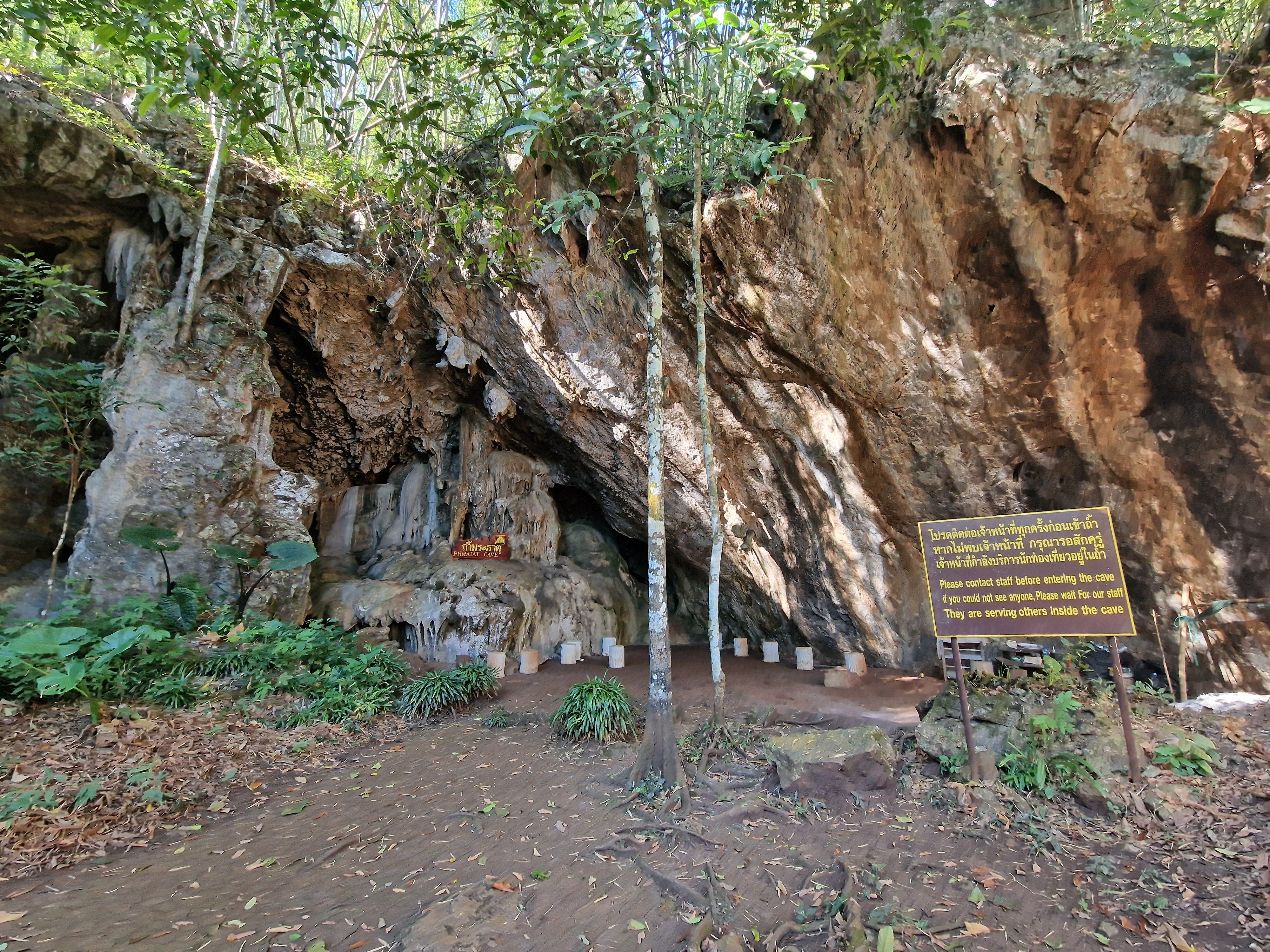 Het is duidelijk dat ook wat geld van Erawan Waterfalls naar hier vloeit. Wanneer ik na een stevige klim de toegang tot de grot bereik zie ik een aantal zitplaatsen en een informatiebord waarop staat dat ik eerst een medewerker dien te contacteren en erop dien te wachten vooraleer de grot binnen te gaan. Het knettert even in mijn brein. Hoe wordt ik verwacht een medewerker te contacteren? Ik ben als enige toerist naar boven gestuurd. Hier is niemand te zien. Ik kan toch niet helemaal terugkeren om iemand te halen en terug naar boven te klauteren?