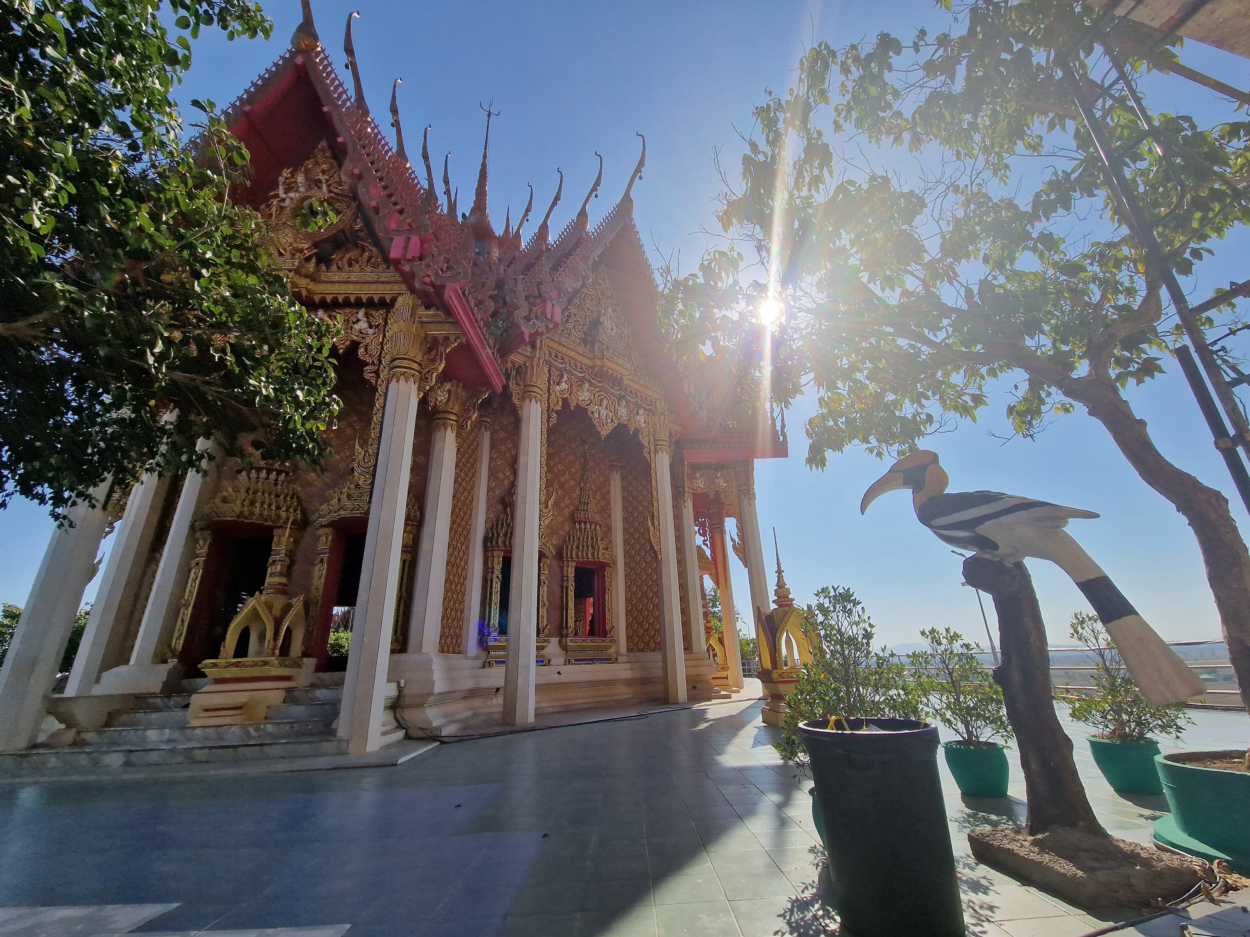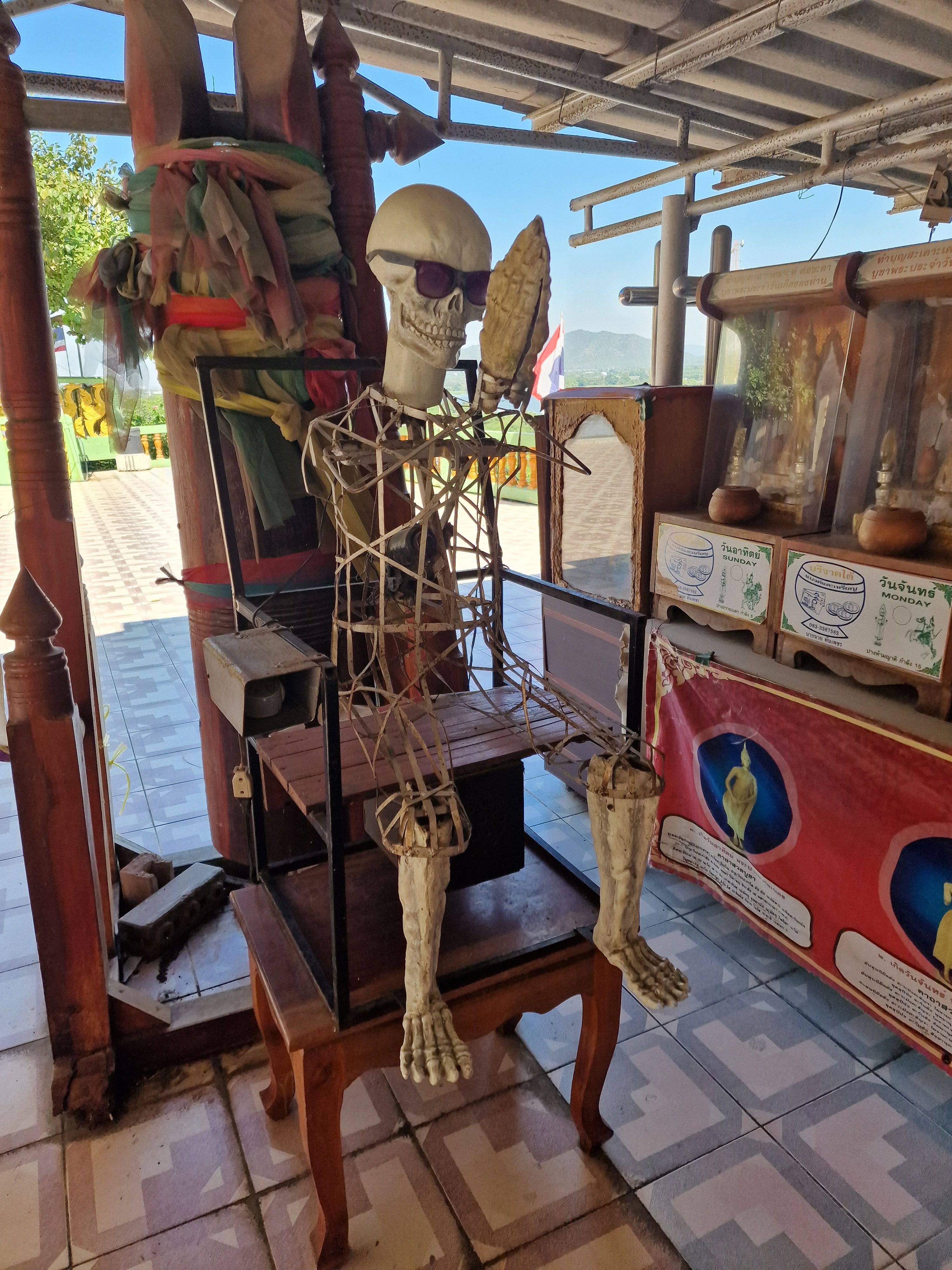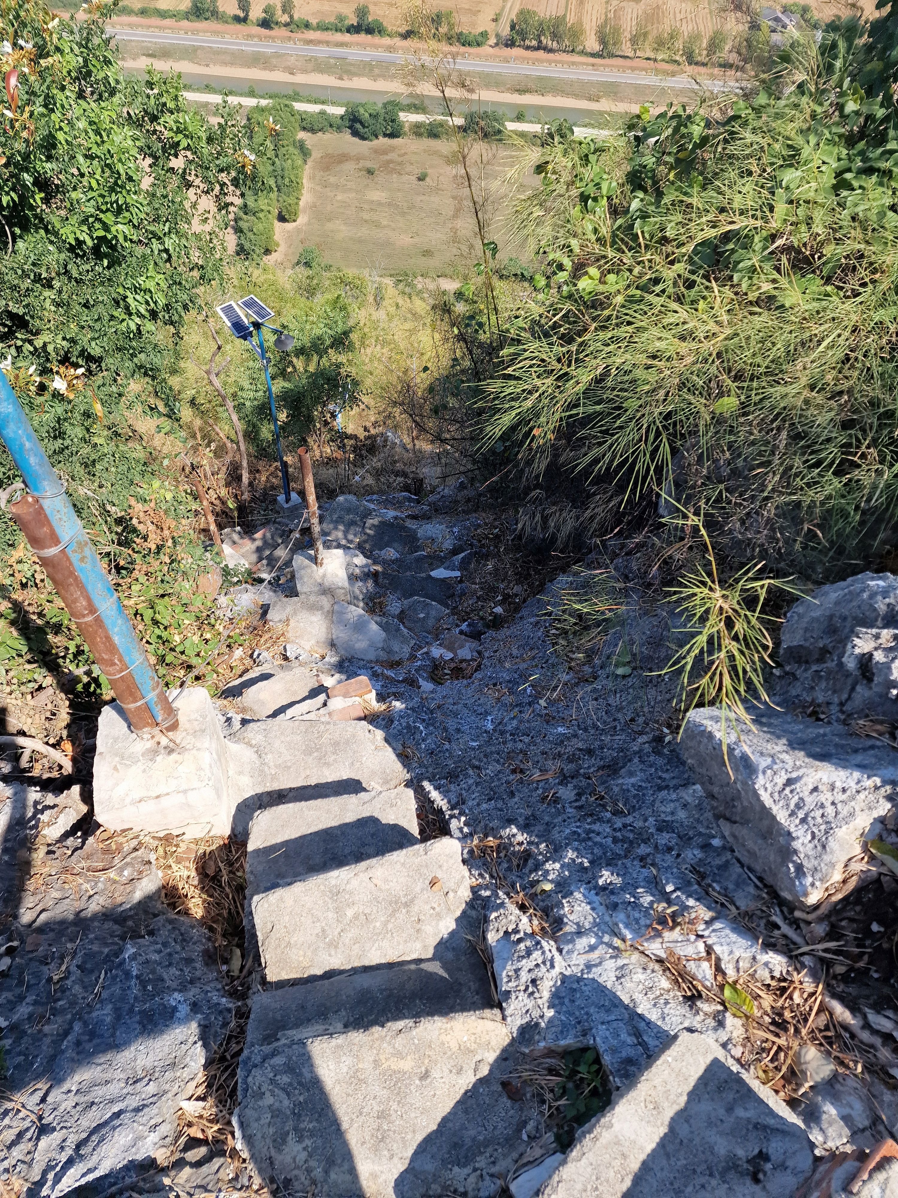 Het is duidelijk dat ook wat geld van Erawan Waterfalls naar hier vloeit. Wanneer ik na een stevige klim de toegang tot de grot bereik zie ik een aantal zitplaatsen en een informatiebord waarop staat dat ik eerst een medewerker dien te contacteren en erop dien te wachten vooraleer de grot binnen te gaan. Het knettert even in mijn brein. Hoe wordt ik verwacht een medewerker te contacteren? Ik ben als enige toerist naar boven gestuurd. Hier is niemand te zien. Ik kan toch niet helemaal terugkeren om iemand te halen en terug naar boven te klauteren?