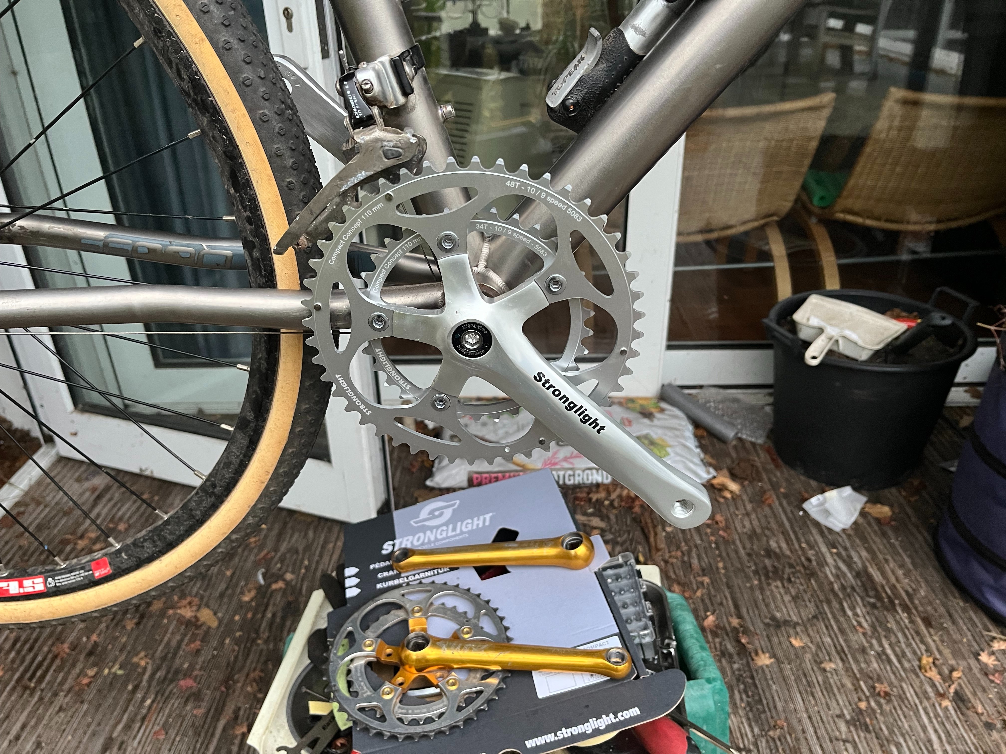 Dat de Stronglight cranks verder naar buiten uitbuigen is een design kwestie. Ik heb daar niet op gelet bij de keuze. Nu ik nog eens naar de specs kijk, zie ik het ook nergens staan.