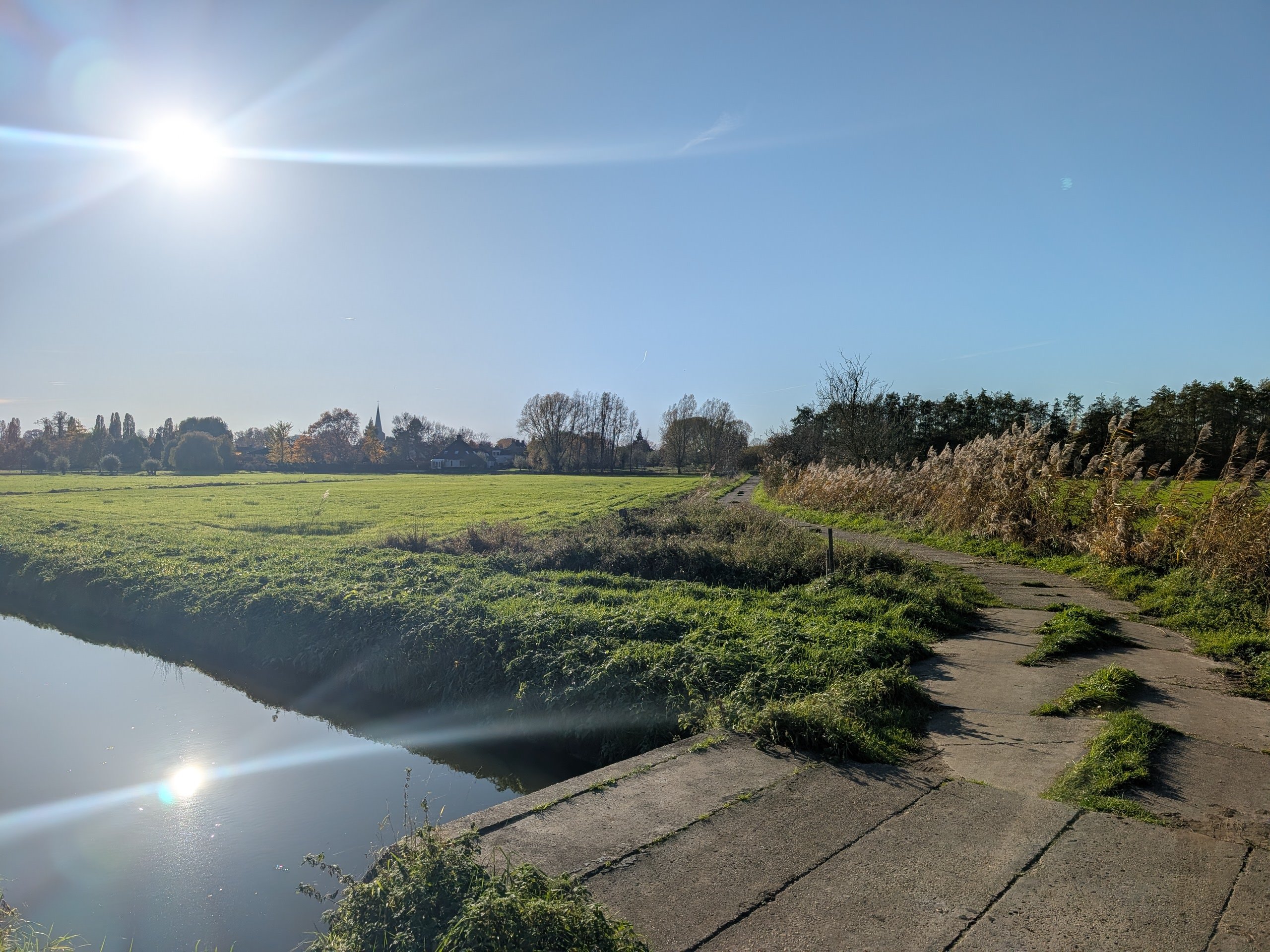 En dan het weer vandaag: strakblauwe lucht, windstil, korte broek aan en fietsen!
