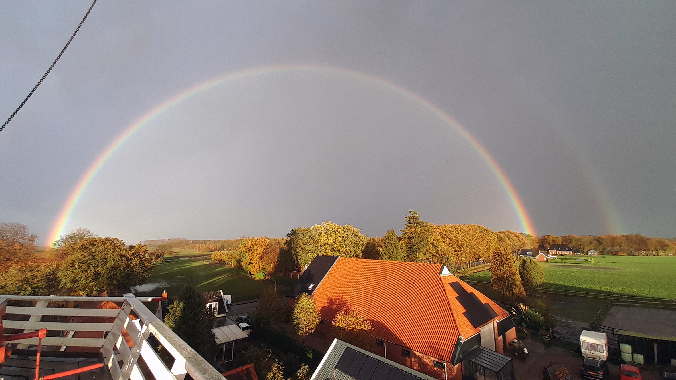 Vandaag op mijn molen in Kolham gedraaid. Maar nog nooit zoveel regen meegemaakt als vandaag! Zelf op 12 meter hoogte stroomde het water vanaf de stelling over de vloer naar binnen. Rond 15.00 uur zag ik een felle, dubbele regenboog. Zelf enkele ogenblikken was er een derde regenboog te zien!
