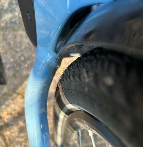 MAAR... we lopen tegen iets aan of beter gezegd: er loopt iets aan. De achterwielen zitten heel erg krap in de achtervork, er is maar zo'n 1-2 mm ruimte tussen band en achtervork. Bij volle bepakking, met wiel iets scheef of bij rijden op een modderige weg loopt dat (dus) nogal snel aan, heel irritant. Het wiel kan niet verder naar achteren want de Gates-riem staat al strak.