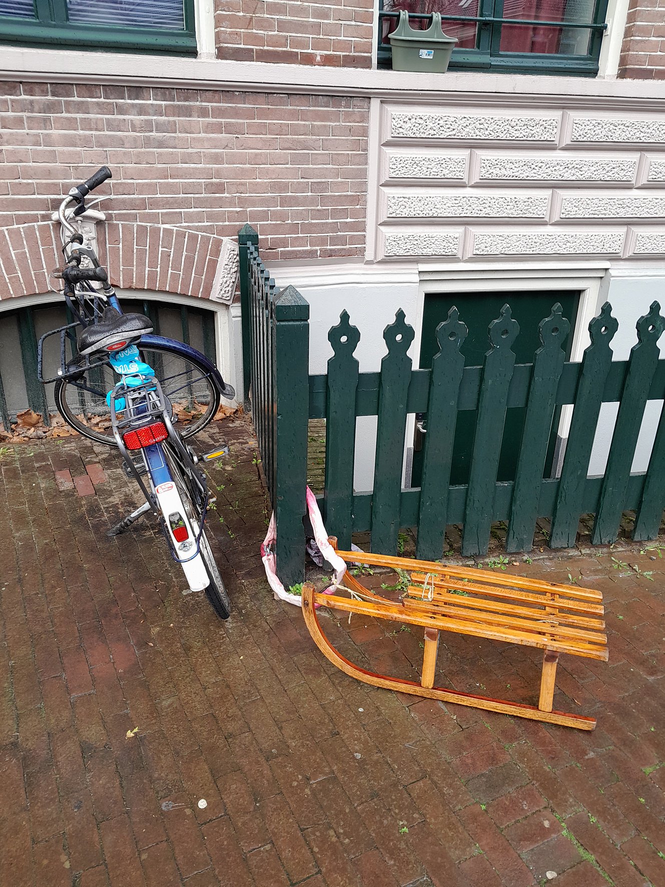 Je ziet wel vaker fietsen, bromfietsen, scooters of motoren met een kettingslot aan een vast object geplaatst, maar een doodgewone slee? En we hebben lang geen sneeuw gezien....