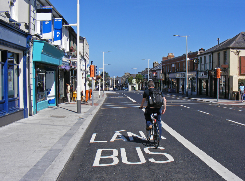 Ik kwam dit op het spoor door te googelen op "Lána bus in Ireland".Er zijn op doorgaande straten busbanen (met de witte letters Lána bus op het wegdek), die ook gecombineerd zijn met fietssymbolen. Ook buiten Dublin, zoals in Bray.