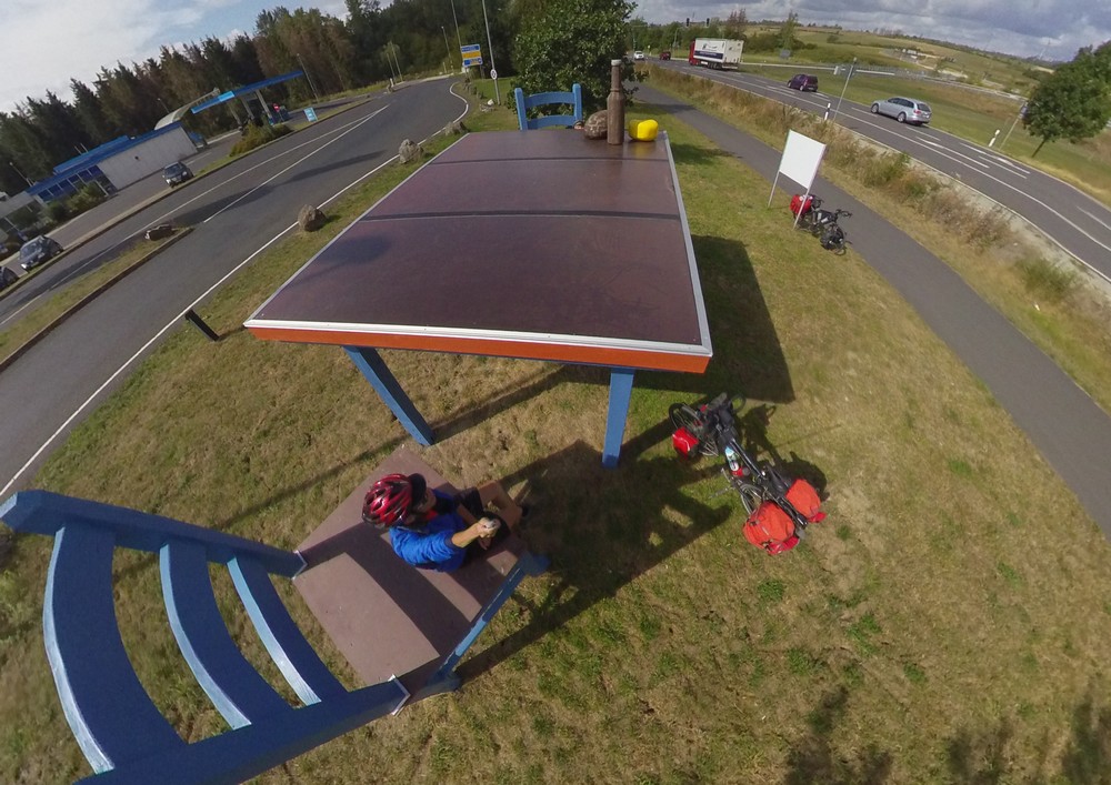 Lijkt me Duitsland gezien de kleurstelling van het benzinestation (Aralblau) en het verkeersbord (geel). Mogelijk in 2017 gezien de set-up van fietsen en fietstassen die overeenkomt met die van het fotoalbum over jullie fietstocht in het voormalige Oost-Duitsland. Helaas levert "riesen tisch stuhl aral mcdonalds parking etc" niets op.