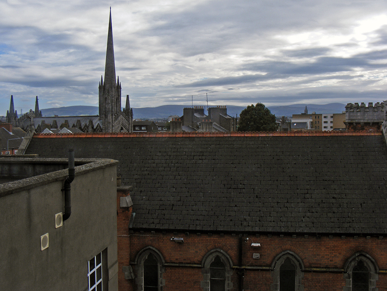 Misschien heb ik het te makkelijk gemaakt, inderdaad Dublin en de naam van de kerk klopt, in de verte zijn de heuvels van Wicklow Mountains te zien. De kapel op de voorgrond met rode vorstpannen is de eetzaal van de jeugdherberg, zoiets als in de Harry Potter-films, met helaas geen zwevende kaarsen maar kille TL-bakken.... De jeugdherberg van Dublin was vroeger een convent school voor jongens in kloosteropleidingen.
