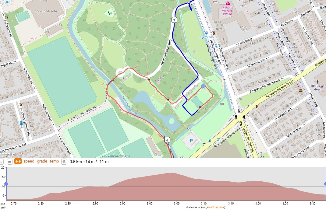Hieronder een stukje door een park. Het profiel is gemaakt met RWGPS. De weg is echter nagenoeg vlak, hooguit enkele meters oplopend. De GPS track is niet helemaal nauwkeurig waardoor de track soms naast de weg zit. Er zitten wat glooiingen in het park en bomen waardoor het mis kan gaan. Zie ook https://www.mapillary.com/map/im/ouvFNLqeUa2Ozr5zAZhiYw met 360° beelden van dit stukje.