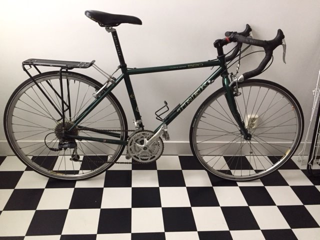 Ivm verhuizing (en dus opruimen.......) te koop aangeboden 2 racefietsen Trek Touring 520 (blauw en groen), uit 2000 en 2002, incl. bagagedragers en lowriders.