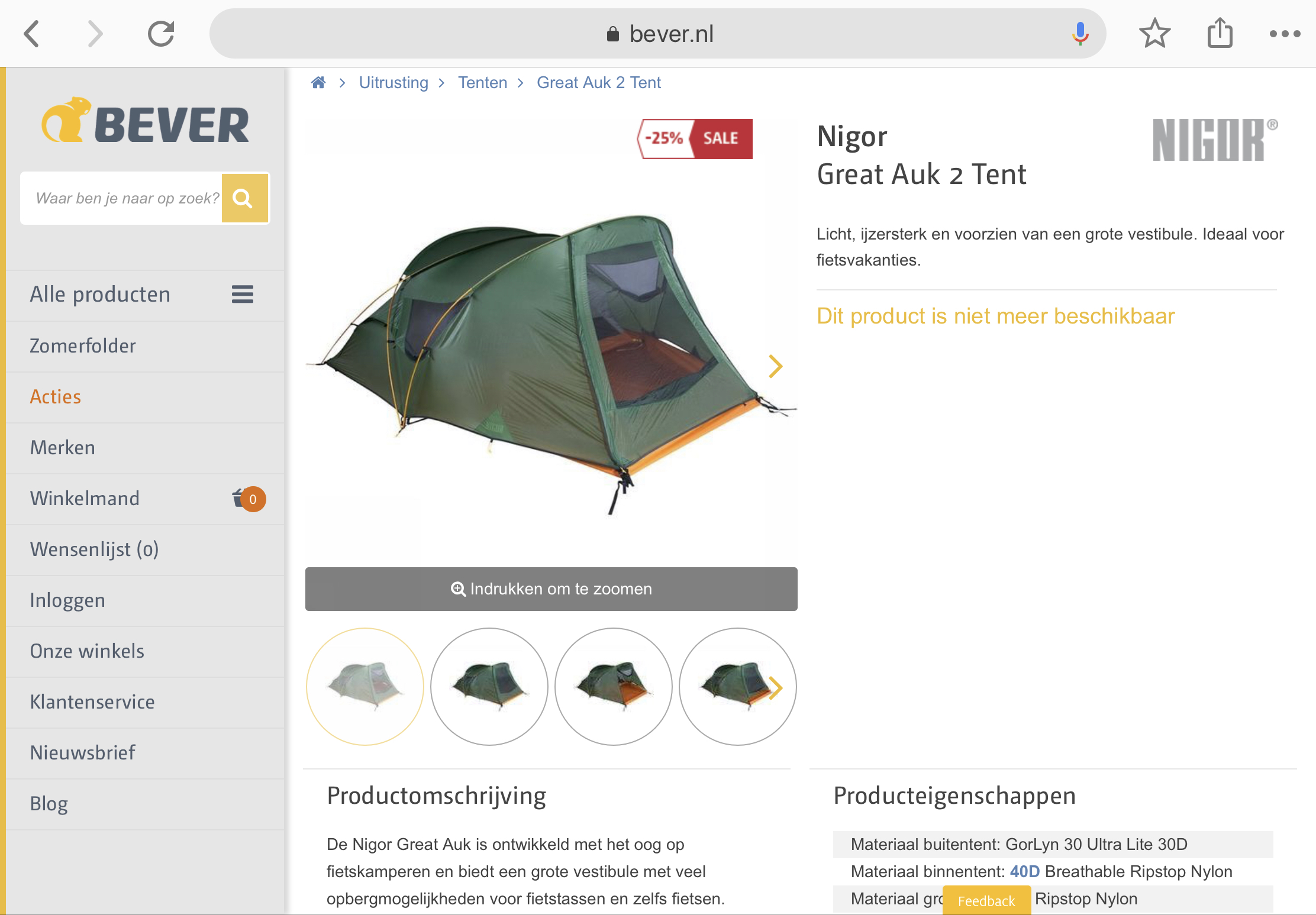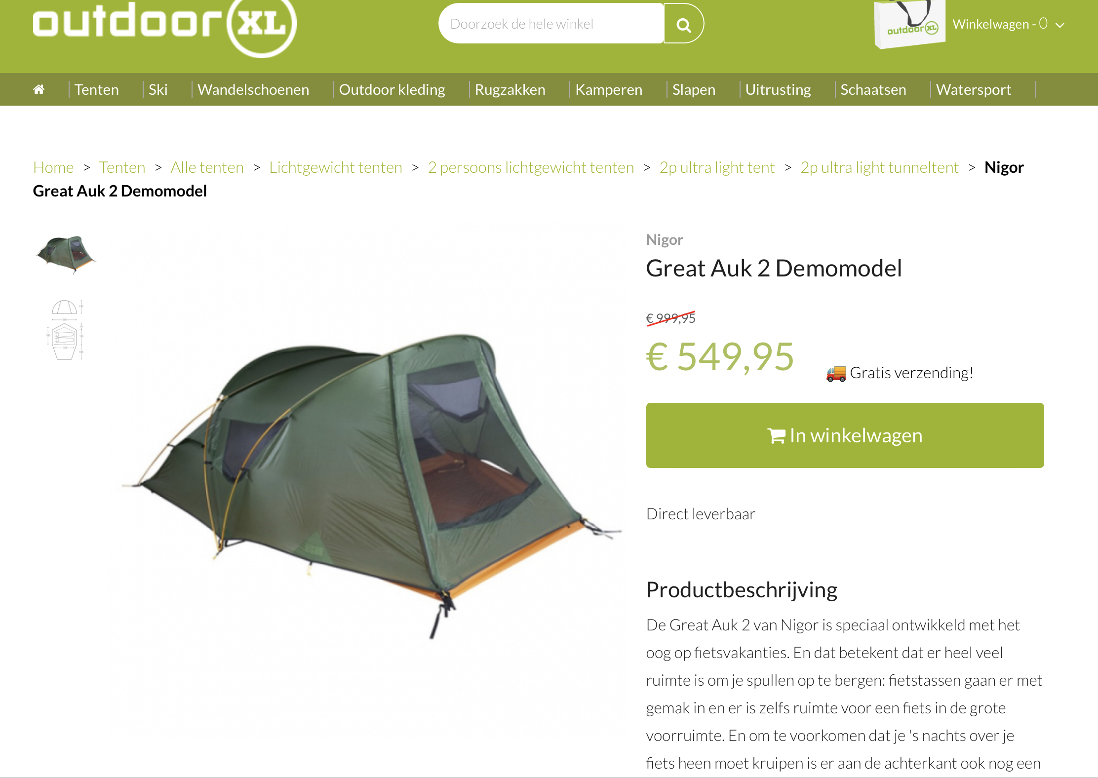 Bever levert de tent niet meer, de laatste voorraad ging met 25% korting de deur uit. Outdoorxl heeft nog een demo exemplaar liggen voor €549,95