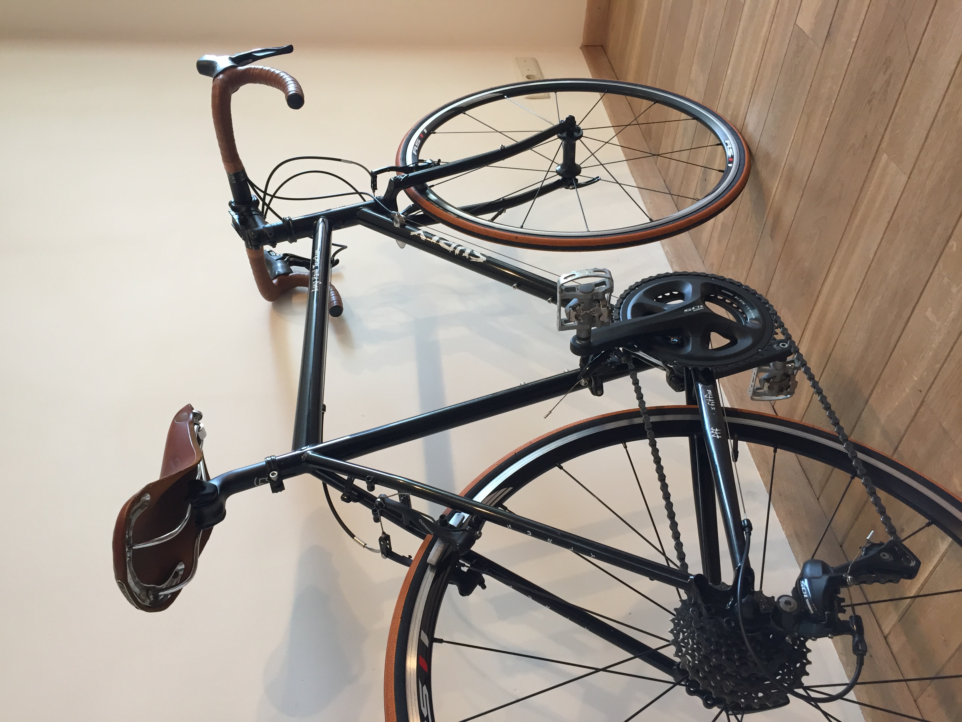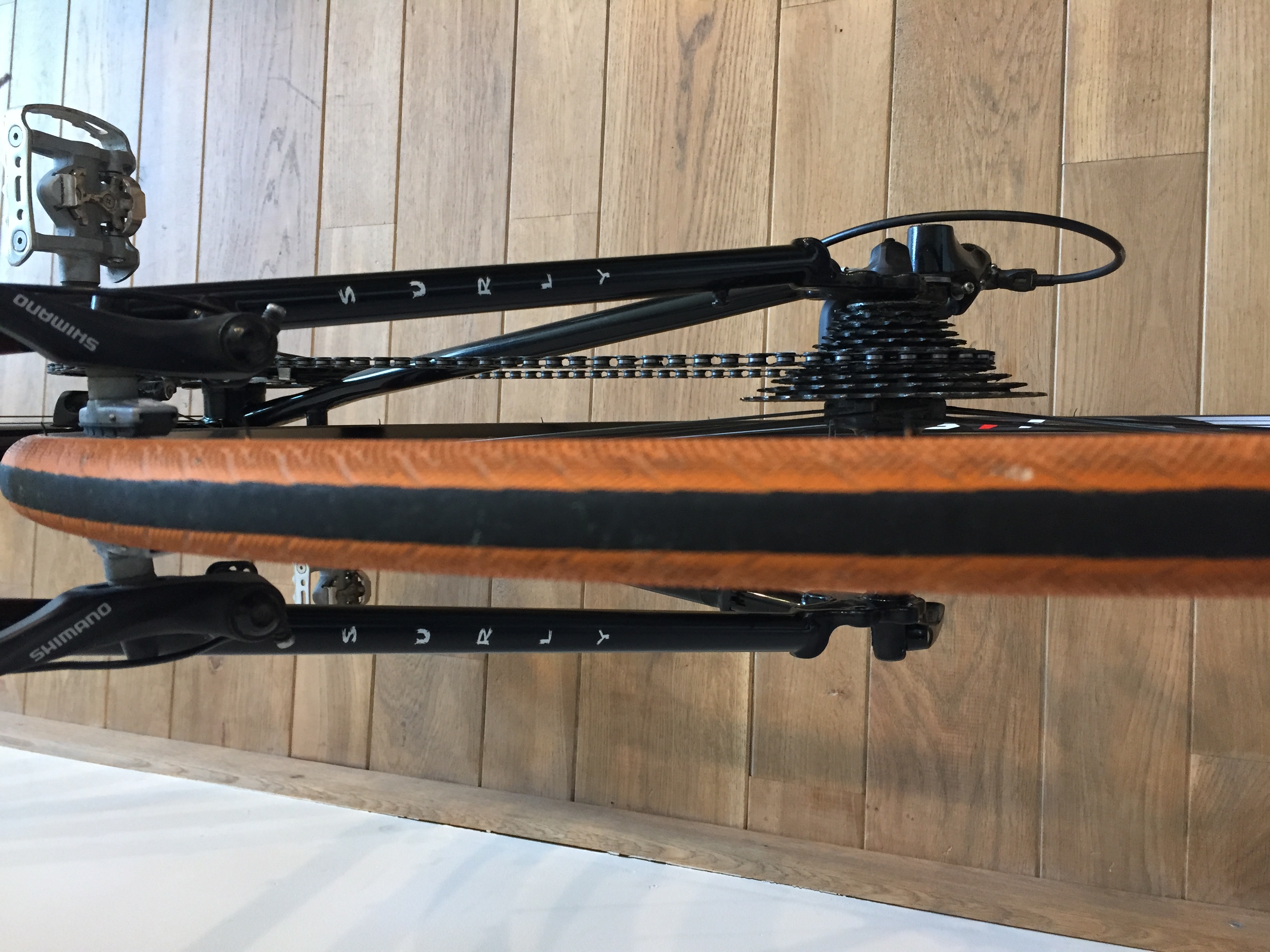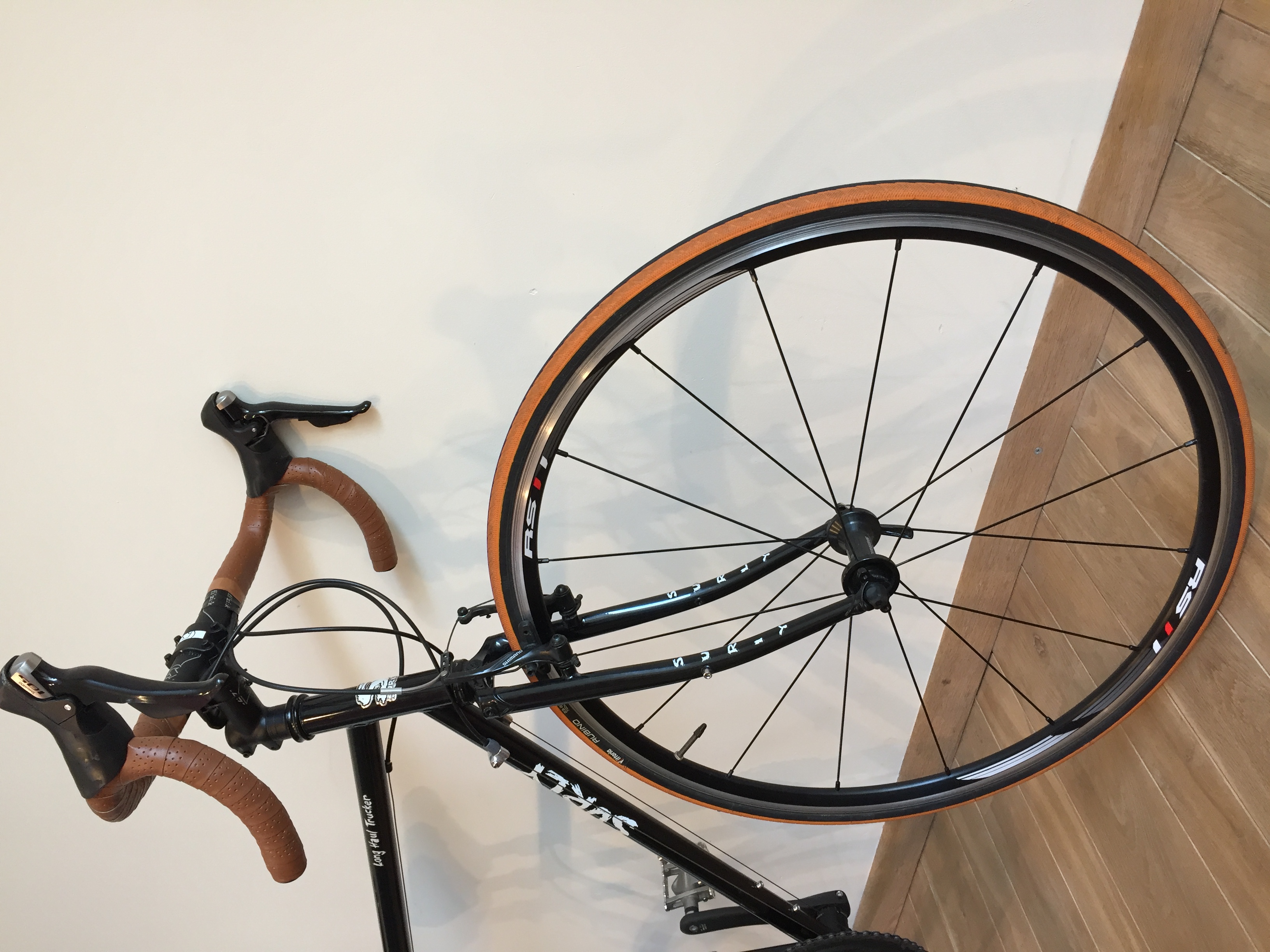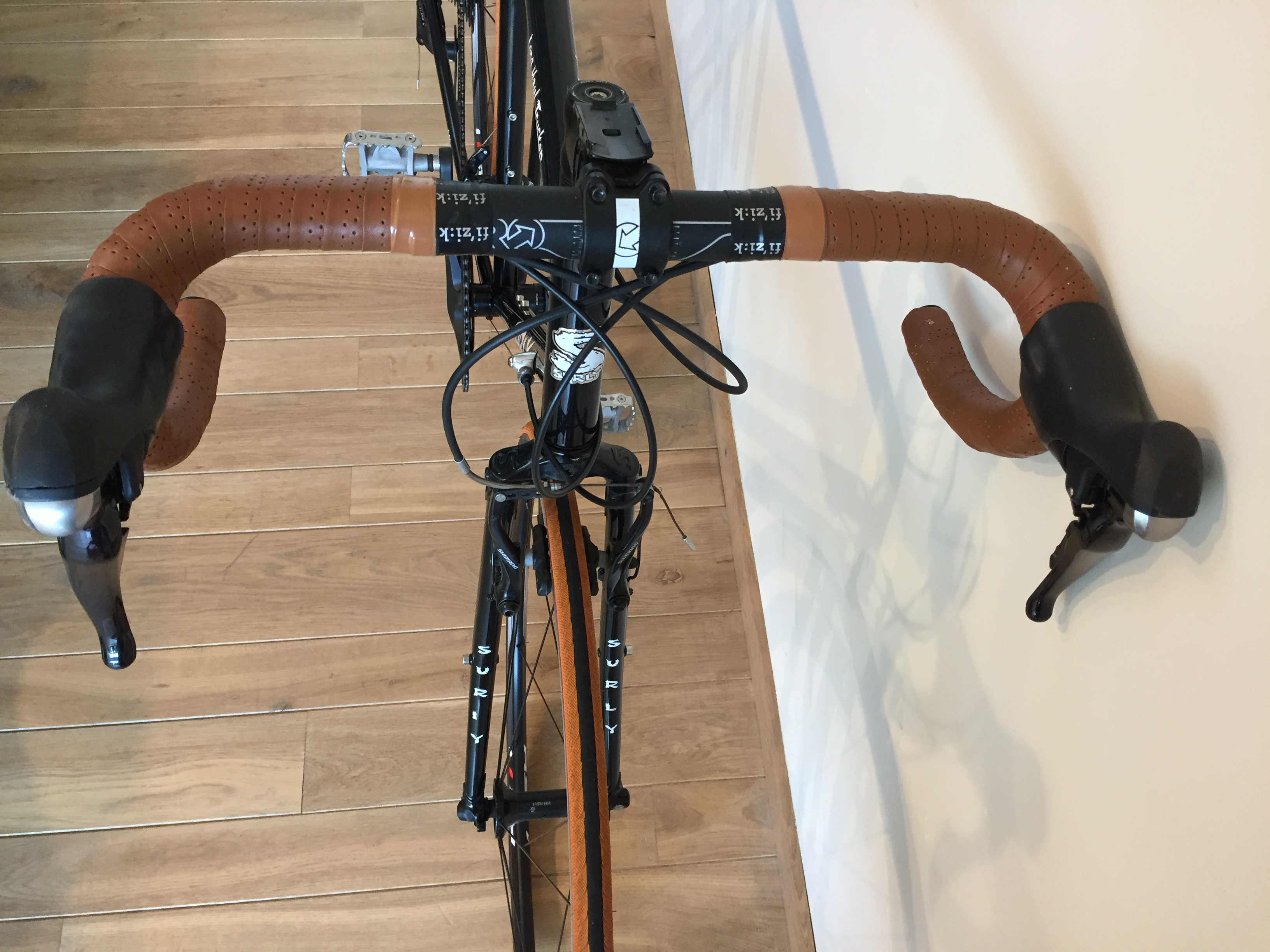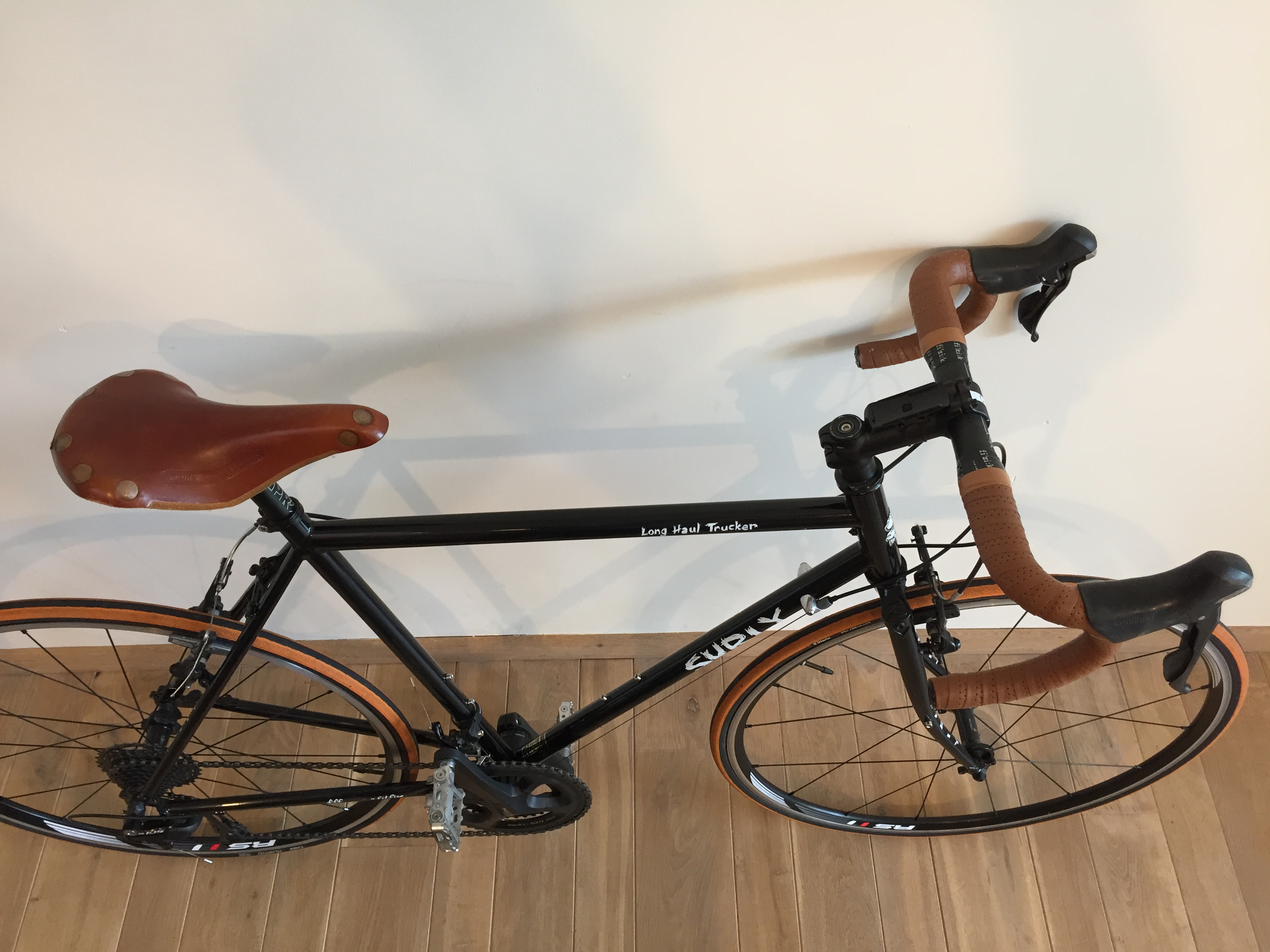 Shimano 105 versnellingsgroep, V-brakes, stuurpen Cane Creek, Bruin Brookszadel, Vittoria Rubino 23/622 banden, RSI velgen, racestuur. Ik verkoop hem, omdat ik op zoek ben naar een fiets die meer rug/nekcomfort biedt.