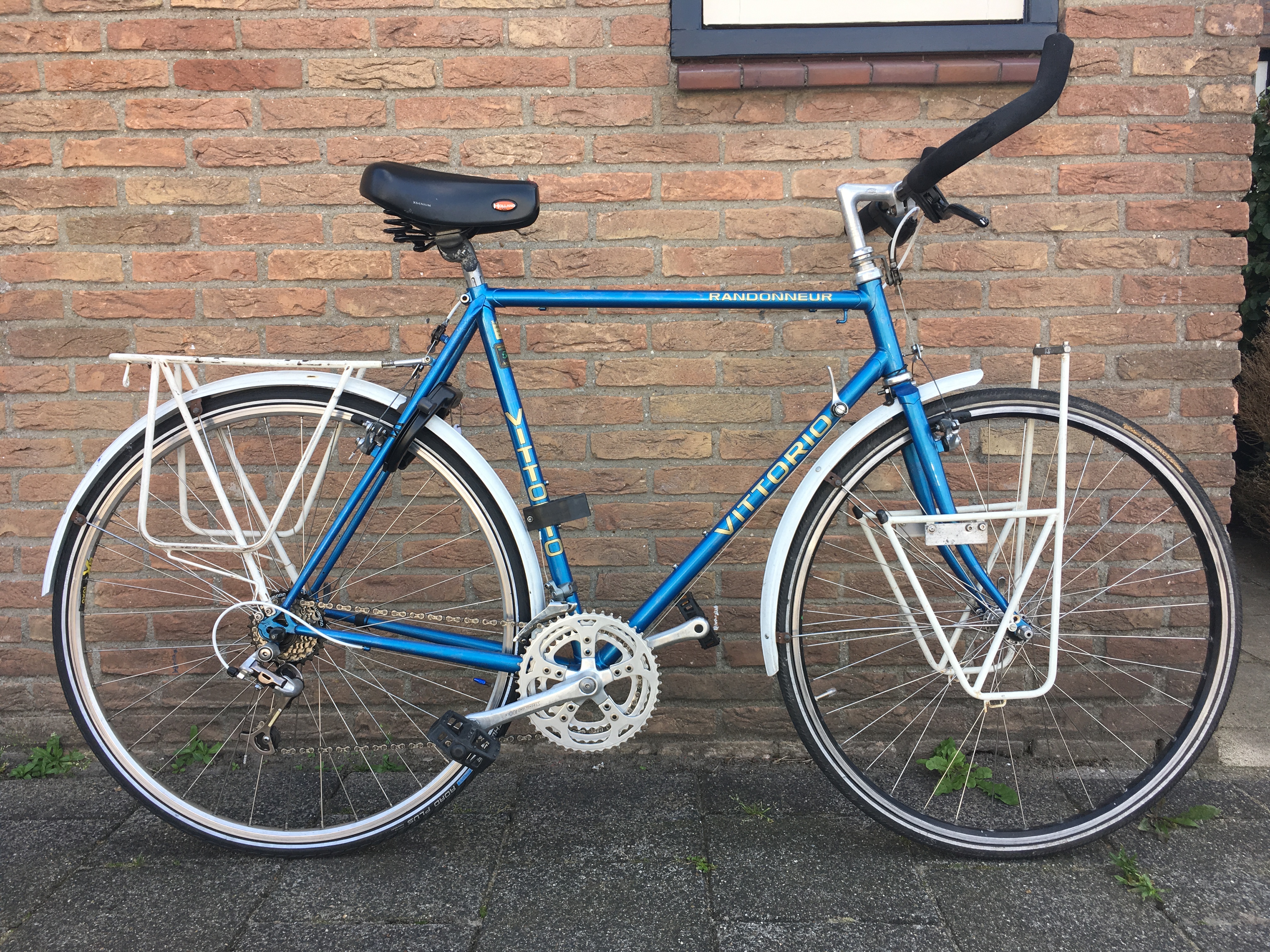 Een Vittorio randonneur uit de 80er jaren, gekocht van een gestopte wereldfietser, met de intentie om er boodschappen mee te doen, maar door te veel fietsen verzameld toch beschikbaar.