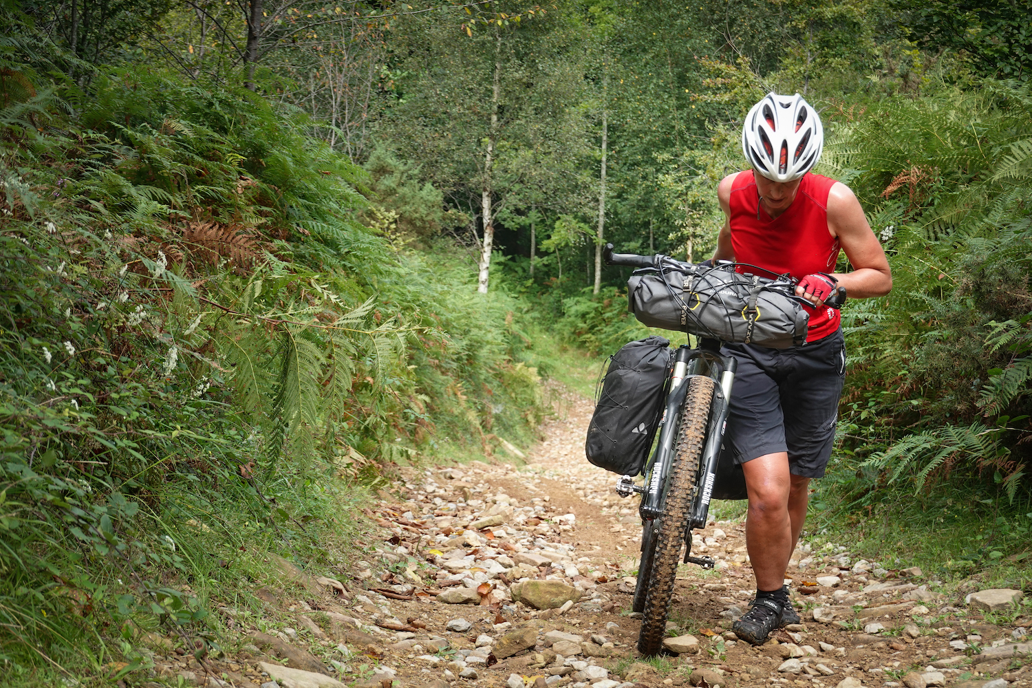 We volgen in grote lijnen de route Vuelta de Vasco. Bikepacking.com heeft de afgelopen jaren flink wat routes verzameld en dat zorgt ervoor dat veel aspirant fietsers tasjes aan hun Bike knopen en de bossen in duiken. Onderweg komen we een Canadees stel tegen op opgewaardeerde racefietsen, gravelracers. Top voor onverharde paden maar minder goed voor een steil mountainbike parcours, Nu is deze route grote delen verhard en ook de onverharde delen zijn best te doen. Maar er zijn uitzonderingen. En op die uitzonderingen gaat de meeste energie en tijd zitten. Achteraf begrepen we van onze Canadese fietsvrienden dat over en stuk van een uur fietsplezier zij 3 uur loopplezier hebben moeten ervaren. Een stevige bikepacker fiets heeft dan zeker de voorkeur.