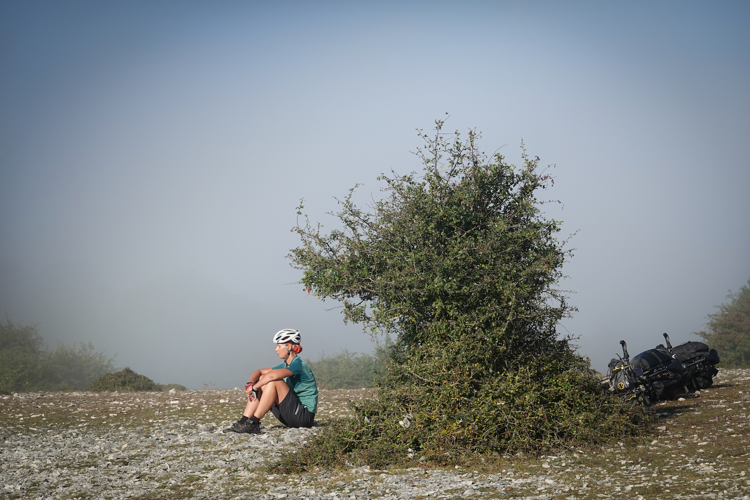 Eenmaal boven de toppen van de bomen is de wereld compleet anders. Grote rollende heuvels strekken zich voor ons uit. De rotsen en keien zijn verdwenen en wat voor ons ligt is een prima gravelweg waar het goed fietsen is. De snelheden gaan omhoog en we stuiven tussen koeienkuddes en groepen paarden door. Met name die laatste zijn het meest aanwezig. Overal rennen groepen paarden over de heuvels. Sommigen voorzien van bellen zodat de eigenaar ze terug kan vinden.