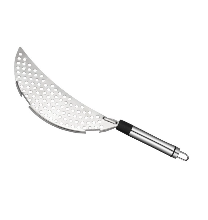 Het is een halve maan met gaatjes en een handvat met scharnier zodat je hem makkelijk kunt opbergen.