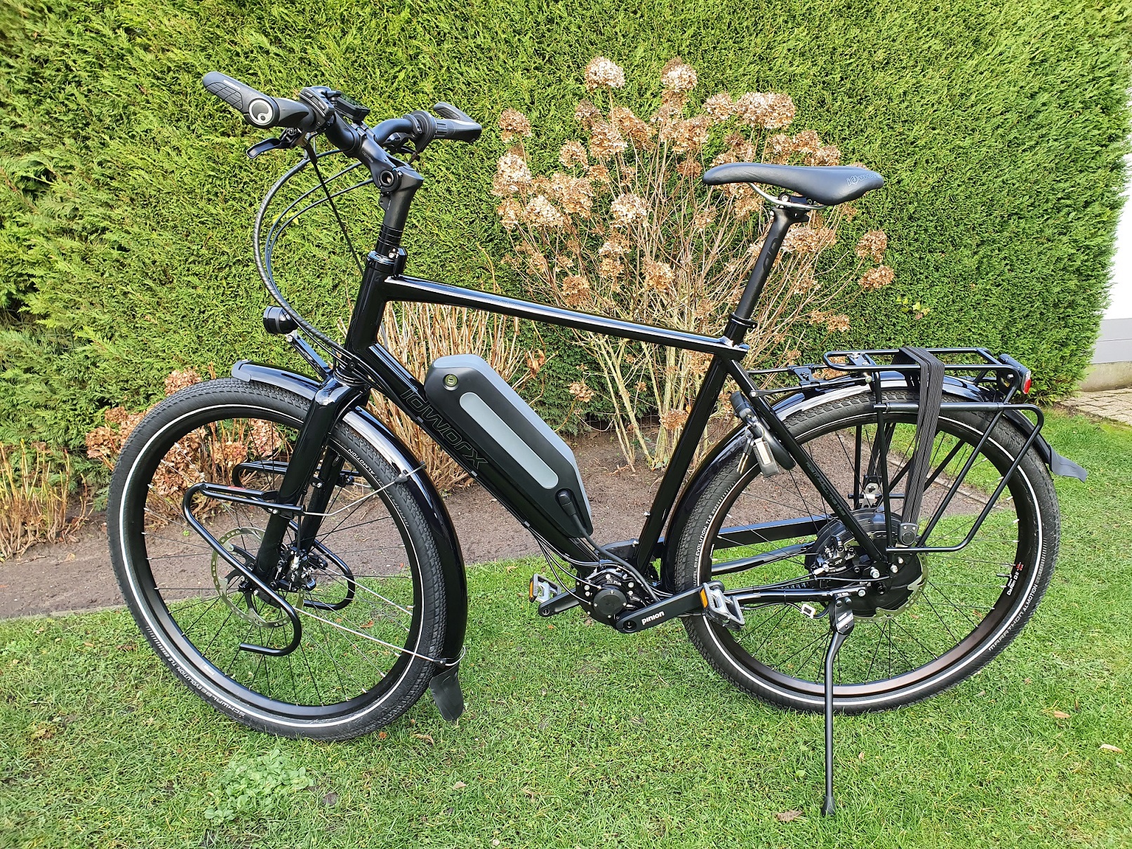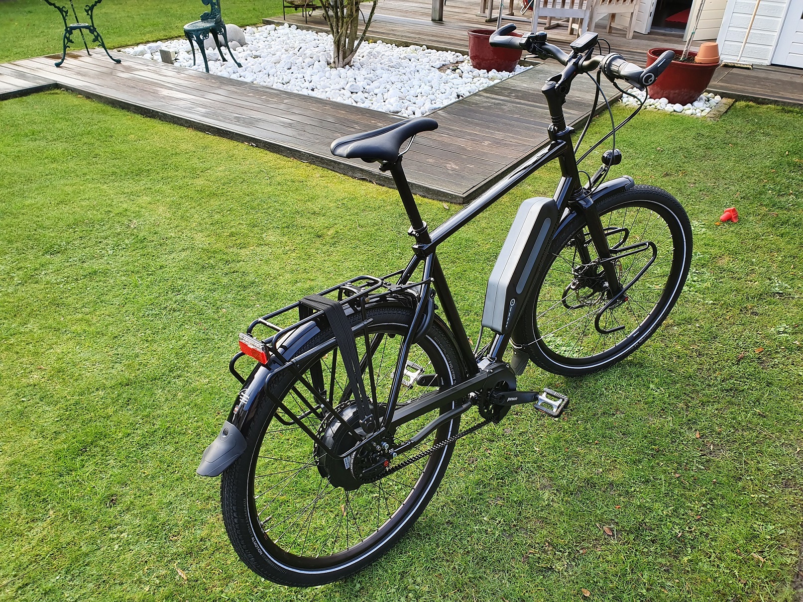 Trotse nieuwe eigenaar Linkerzijde Rechterzijde Voorbouw Vlakke bovenbuis De volgende dag een rondje gefietst. Wat meteen opvalt is de krachtige ondersteuning die reeds in stand 1 (van de 5 mogelijke standen in sterkte) ter beschikking staat. En hoe soepel de fiets er tussenuit wil. Het blijft lopen....Zonder vrijwel enige inspanning met mijn 100 kg continue 25 km/u in de 14e versnelling. De laatste 4 blijkbaar niet nodig gehad.