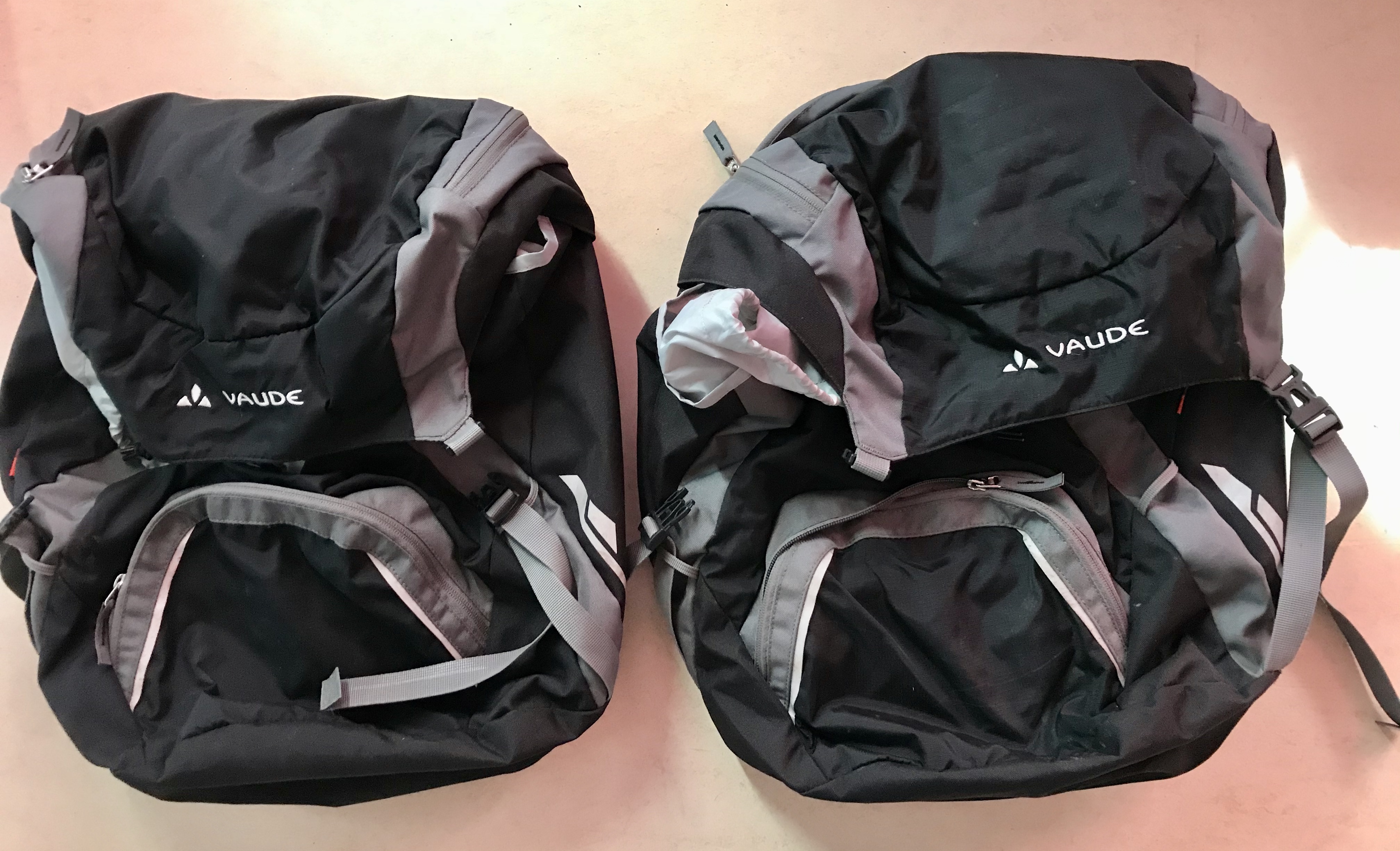 Tassen zijn niet waterdicht, er zit wel een regenhoes bij. Het is een set achtertassen.