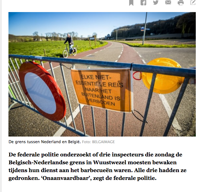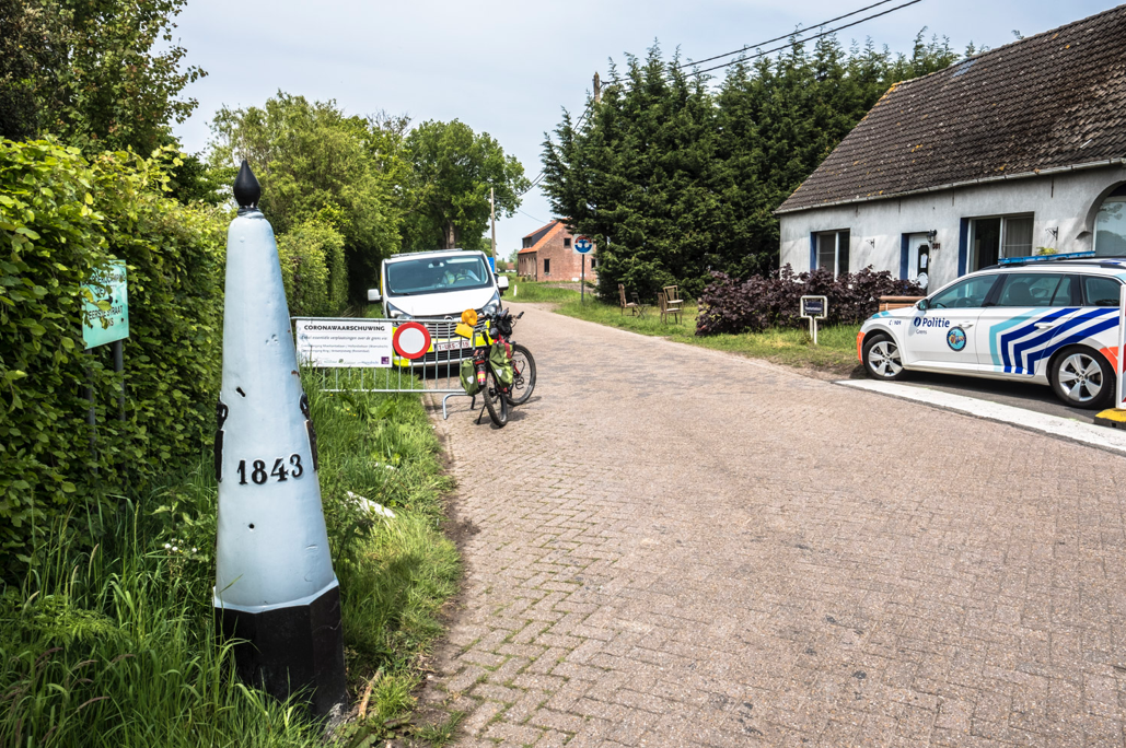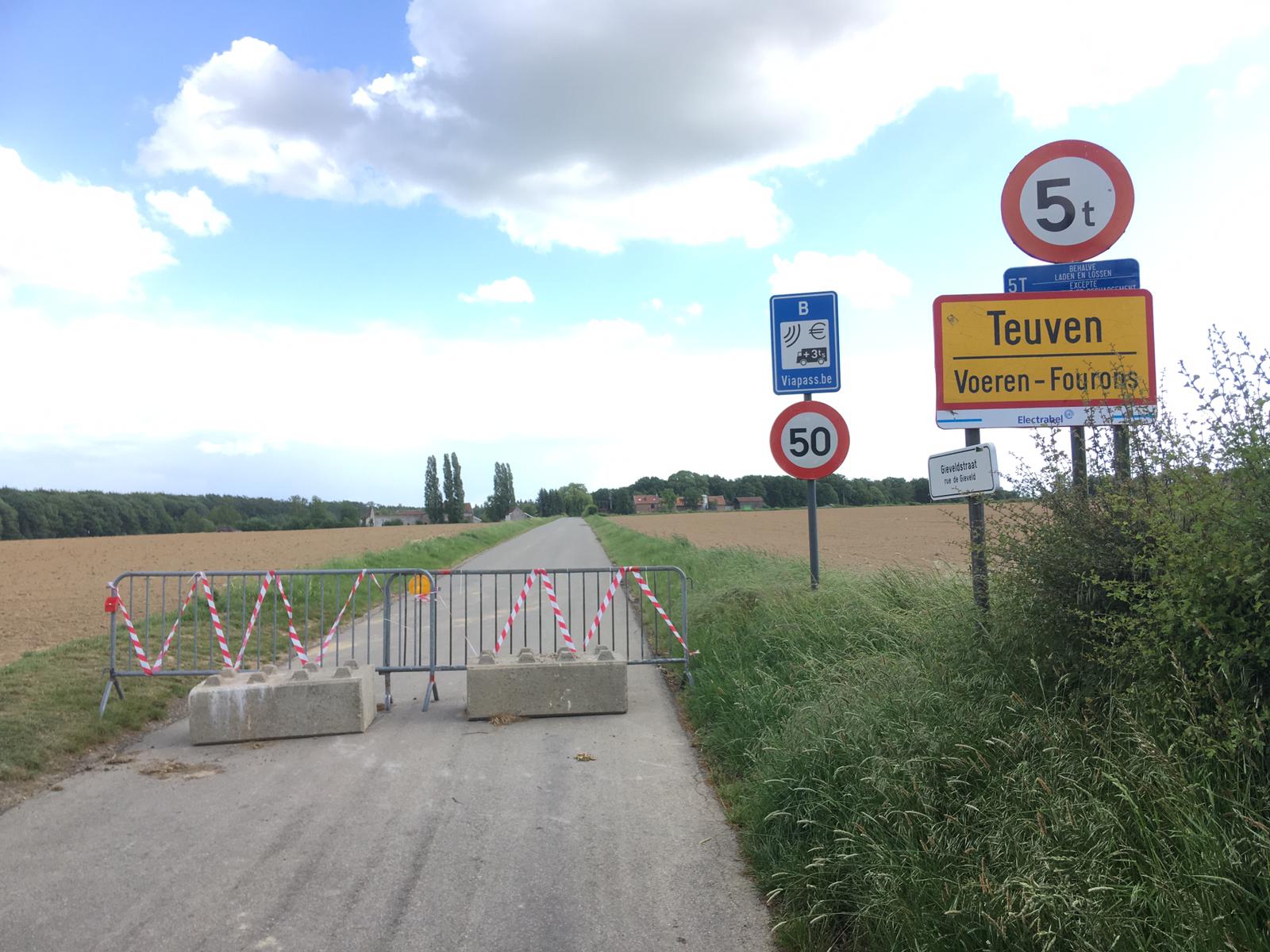 Zo zien enkele van de grensovergangen naar België er inmiddels uit. Omgeving Tilburg. De hekken met versperringen zijn opzij, wandelaars, fietsers en tractoren kunnen erdoor. Auto’s nog niet. Tenzij je meer dan 30cm ruimte onder je auto hebt. En soms is dat ook nog niet genoeg en is de doorgang echt voor fietsers en wandelaars.