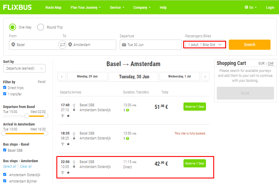 Interessante optie voor mij is bijvoorbeeld een bus terug vanuit Basel, met fiets, directe verbinding, slechts 43 euro:
