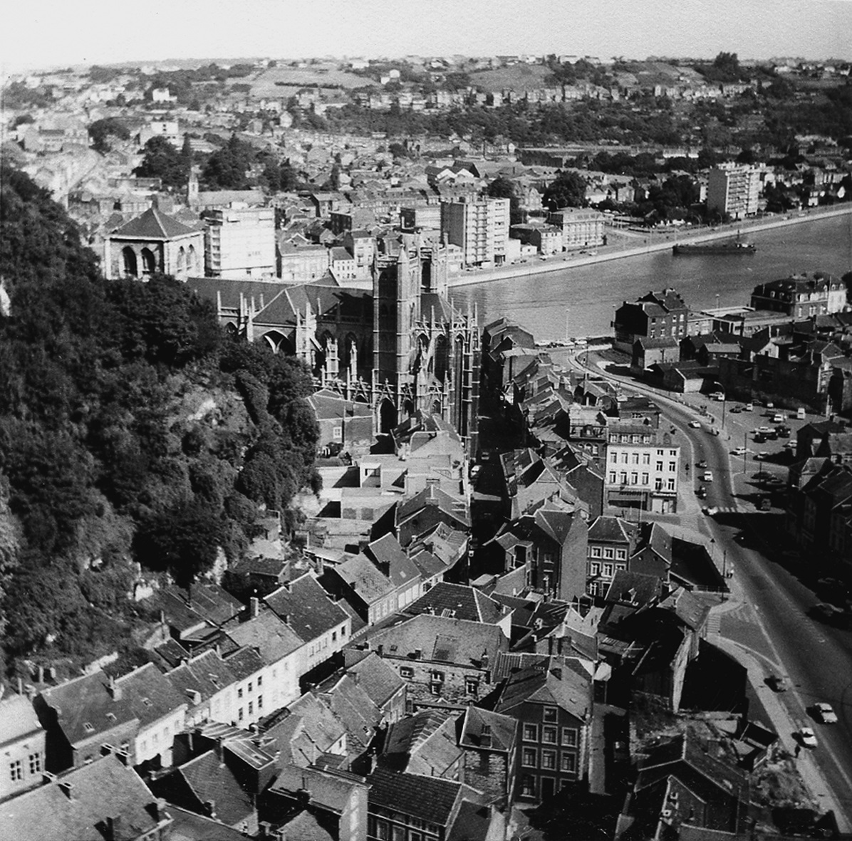 Ik volgde de noordoever van de Maas (la Meuse) naar Huy, een stadje aan deze rivier. Wat een smerige industriegebieden lagen er aan de westkant van Liège. Er was veel staalindustrie. Vanuit de kademuren staken er grote buizen uit, die vloeistoffen in vieze kleuren uitbraakten, zó de rivier in! Maar er was ook luchtvervuiling, walmend uit de vele schoorsteenpijpen. Het was een vrij rommelige weg zonder fietspad, soms laag gelegen met een keermuur aan de linkerkant langs de Maas of hoog over een dijk langs de rivier. Aan de rechterkant stonden wat onordelijk rondgestrooid huizen, café’s, winkels en bedrijfspanden, waarachter soms een kerktoren uitstak. De rommelige omgeving werd langzaam aan groener, naarmate ik Huy (Hoei in het Vlaams) naderde. Boven de Maas verrees een grote grijze kerk, die tegen het warme zonlicht wazig afstak tegen de hoge groen begroeide rots, waarop een grote citadel, die als militaire vesting de plaats sterk domineerde.