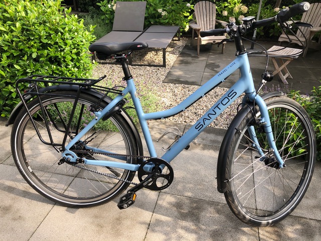 Zo goed als nieuw, volledig onbeschadigd. Gekocht in september 2017, maar weinig gebruikt, km stand is 868 km. Altijd binnen gestaan.Verkoop wegens overgaan naar e-bike van Santos. Overige kenmerken: Kleur is pastelblauw met zwarte letters, Santos travelrack XL, Axa slot, Ergon handvatten dames, Rohlof en Son zijn zwart van kleur. Fiets is te bekijken bij interesse. Prijs: bieden vanaf 4.150 euro (huidige nieuwprijs met gelijke samenstelling is 5.459 euro) Voor de fiets, zie afbeeldingen.[/b]