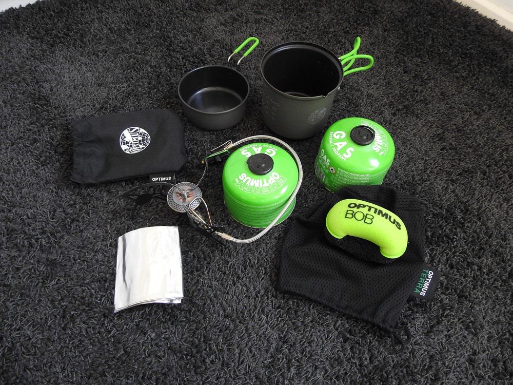 Complete Optimus kookset, bestaande uit een Vega brander en een Terra Weekend HE pannenset.